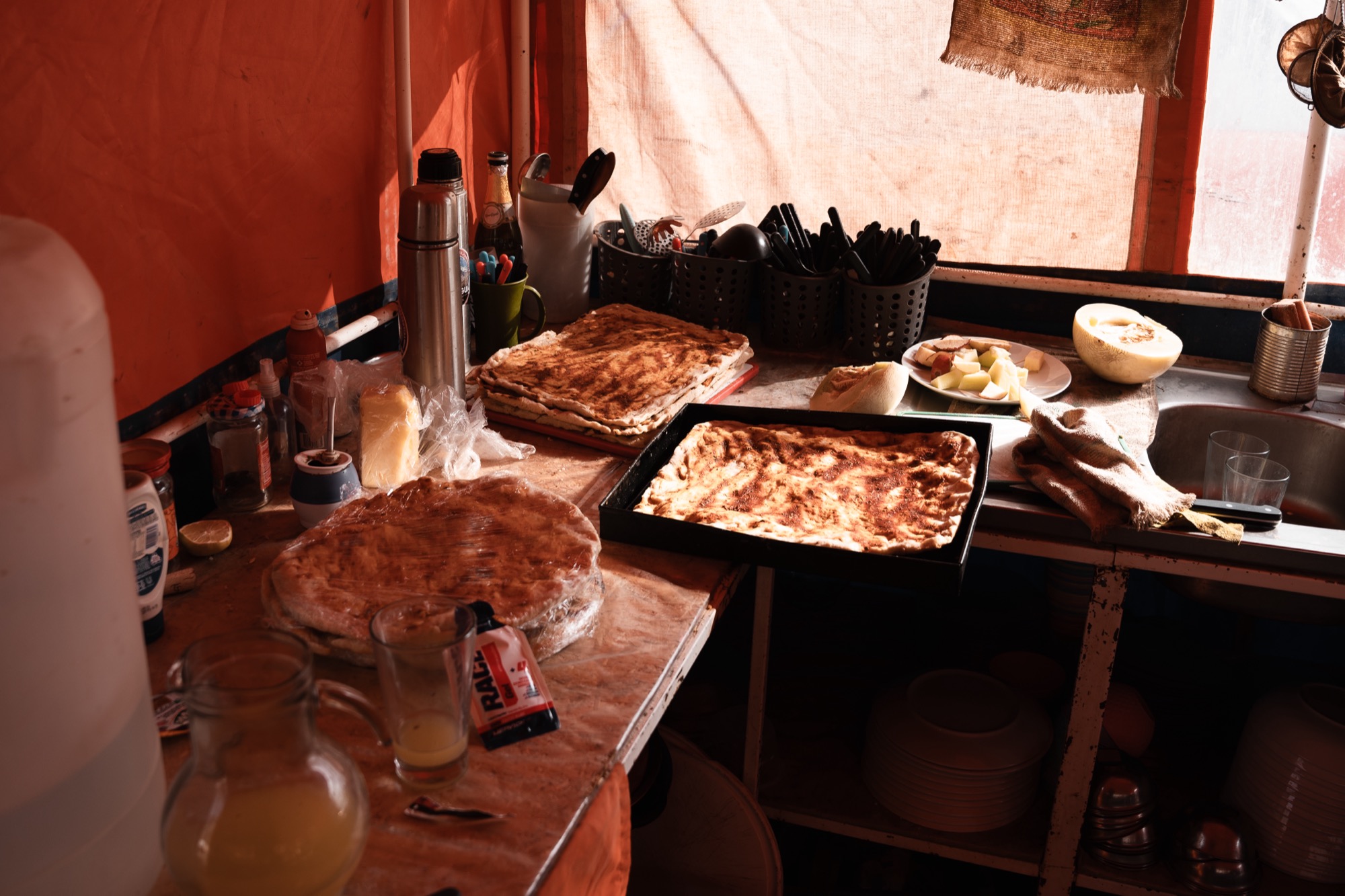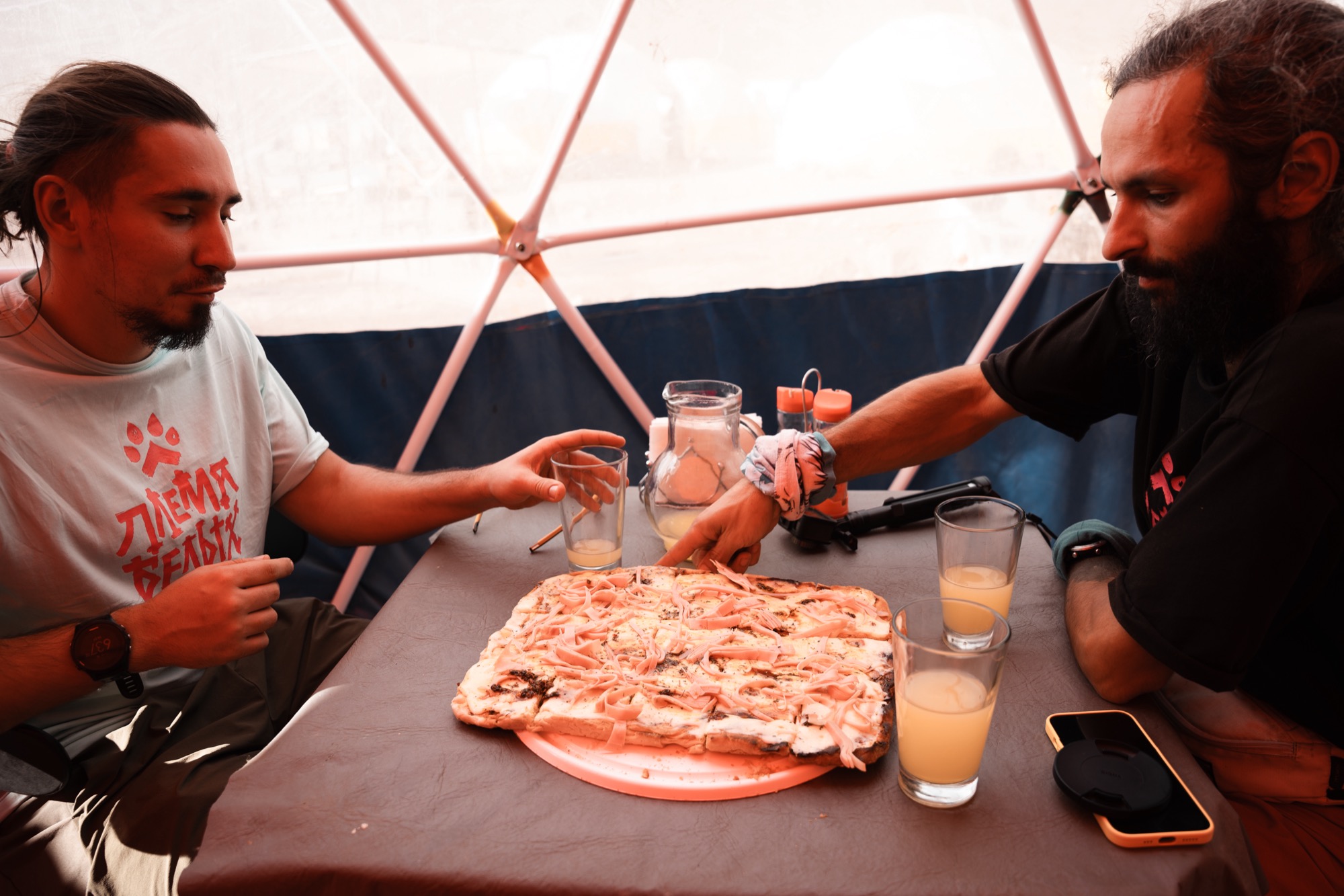 У нас же было всё по скромному, так сказать по альпинистски. Пермиты мы получали от компании Lanco, еду и сопровождение мы не брали, но в первом лагере не смогли отказаться от пиццы с соком.