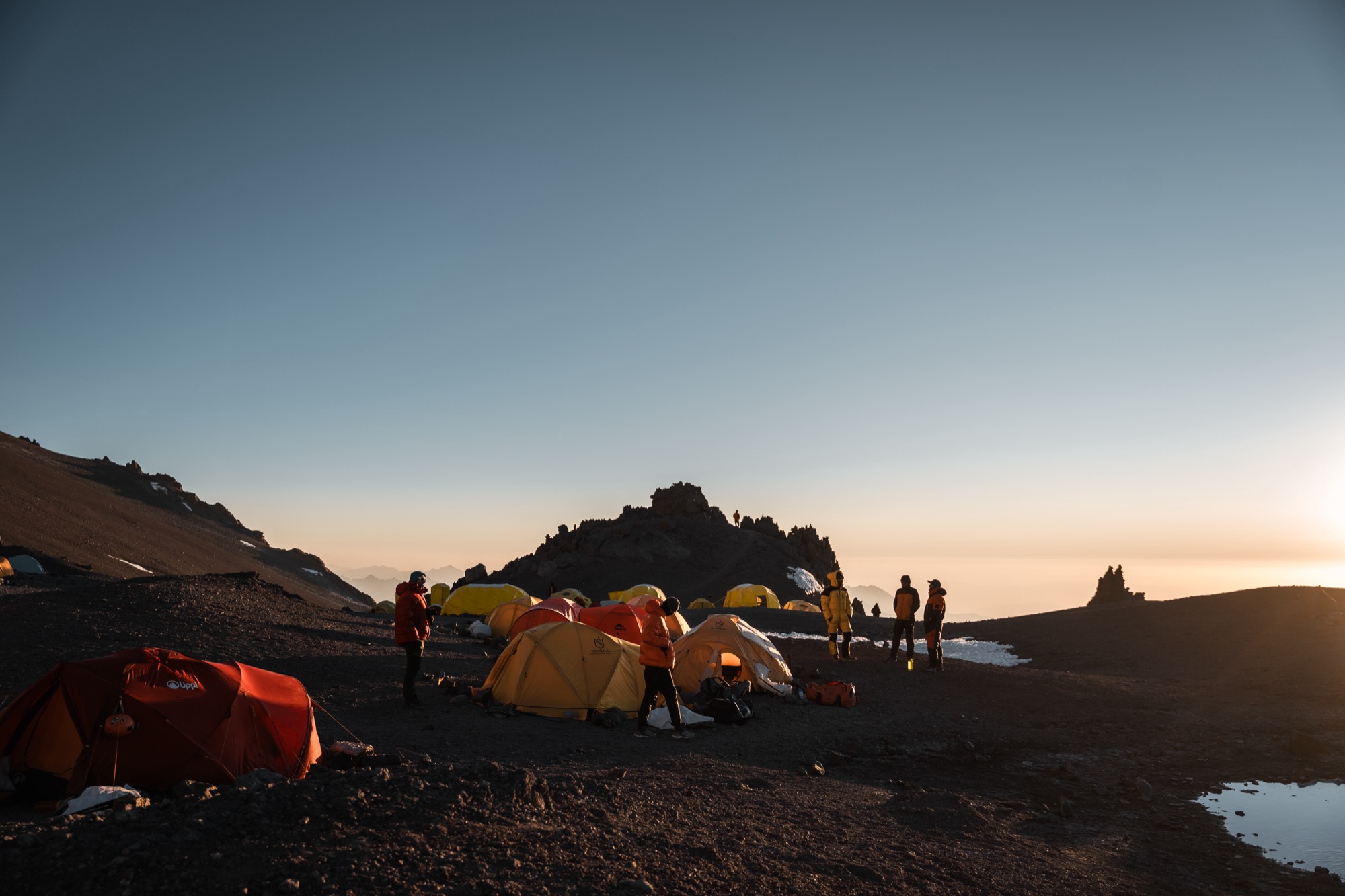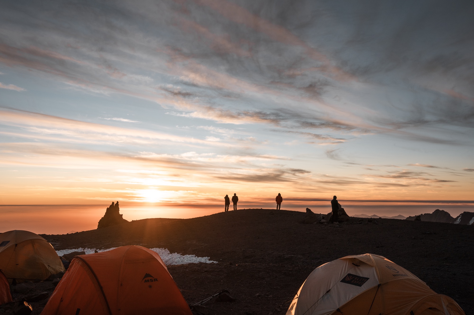 Уже спустя 3 часа после выхода с 4300 мы подходили к лагерю на 5000. Пообедав и немного отдохнув, я оставил ребят и пошёл ночевать на 5500, взяв с собой трехместную палатку, в которой мы будем ночевать в верхних лагерях. Придя в лагерь и поставив палатку, я приготовил ужин и встретил умопомрачительный закат. Погода была шикарной, ни ветра, ни облаков. У ребят тоже был обалденный вид: