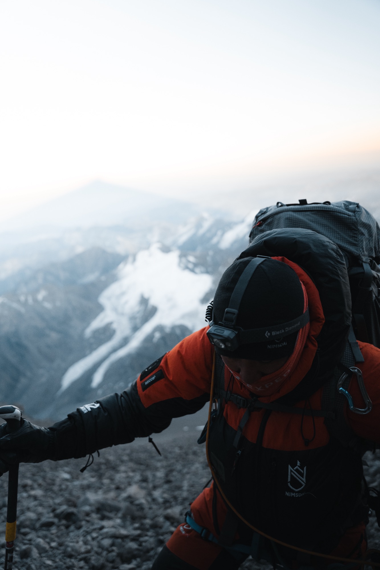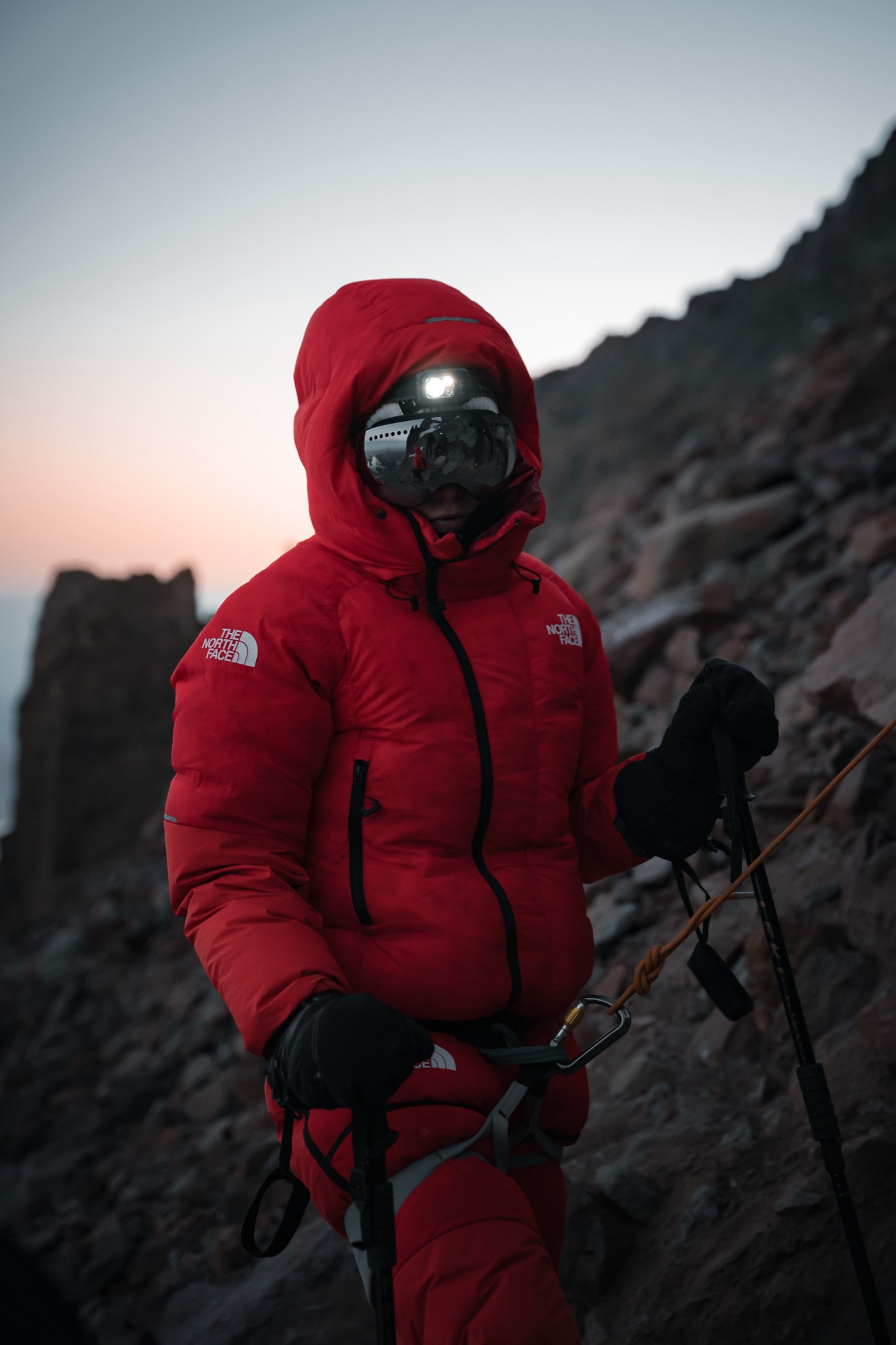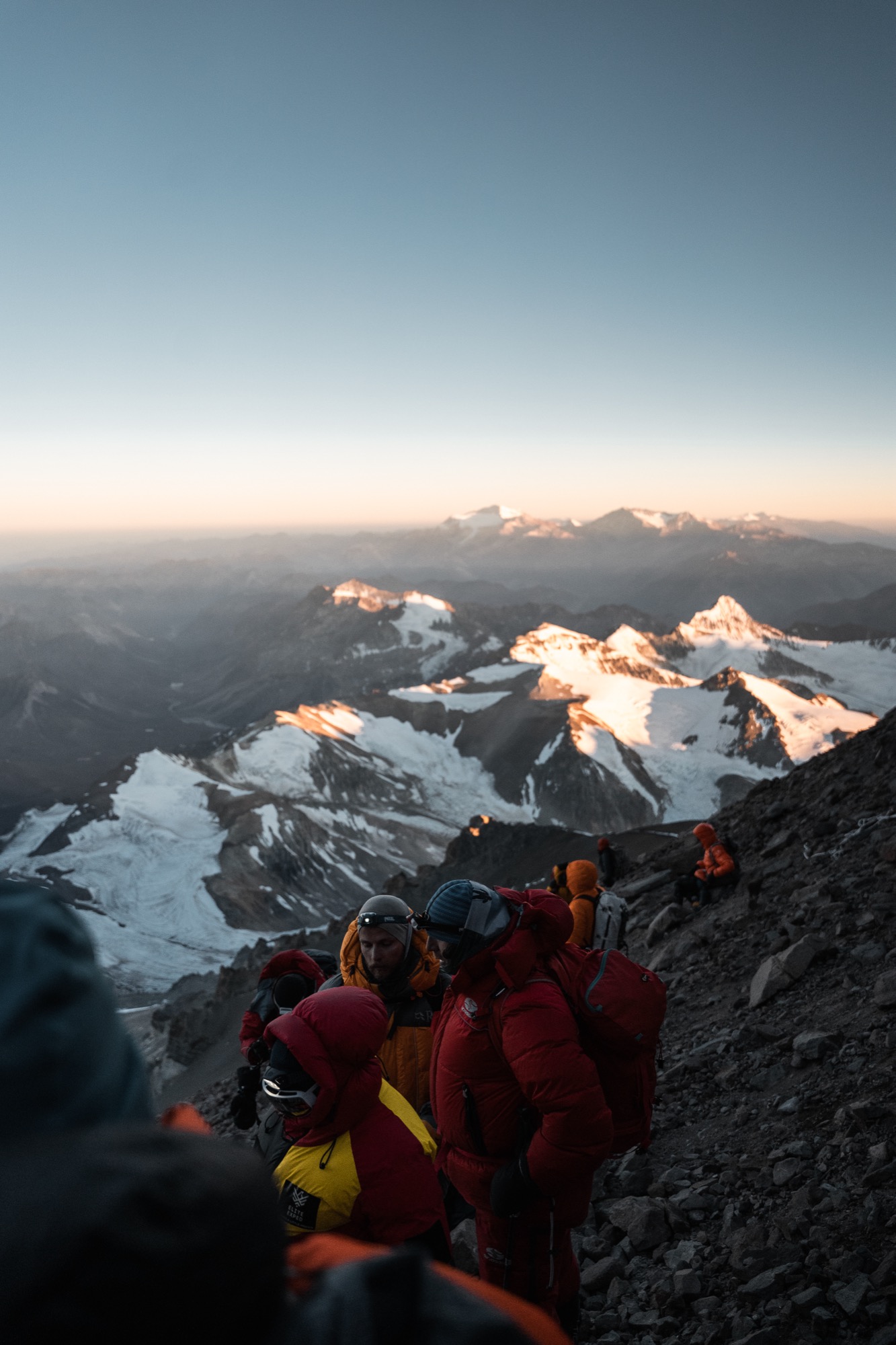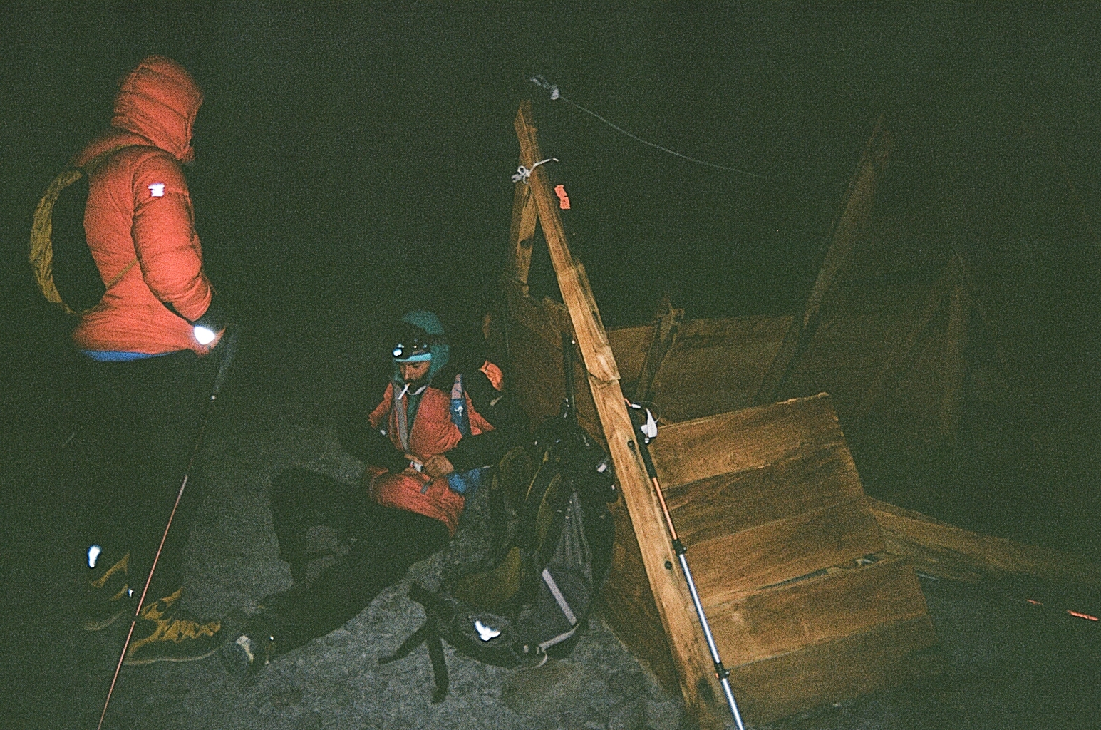 2 часа ночи. Подъём. Костя с трудом надевает ботинки, на горе уже виднеется вереница фонарей. Кто-то вообще только спускается с прошлой ночи. Они уже сутки на высоте более 6000 метров. Тревожно. Кромешная тьма и только тусклый свет фонарика себе под ноги создаёт ощущение жизни. Долгий серпантин наверх. Когда начало светать мы уже были на высоте 6600 метров. Мы настигли группу американцев. Как раз в это время Слава достал фотоаппарат: