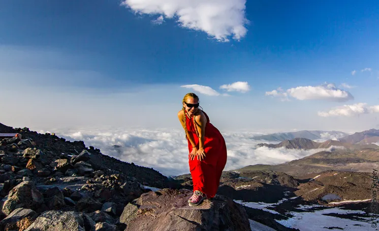 Все шли в пуховках, тяжело дыша и медленно перебирая палками. Казалось, все были уже обессилены к 5000. Дальше еще 400 метров подъема прошли в штатном режиме, размеренно, не спеша, но и не тормозя. Наконец мы дошли до подъема на сам кратер, оставалось 200 метров. Глубокий снег начал проваливаться и я понял, что нужно тропить. Чуть выше нас шла тройка и тропила неплохие ступени, у меня созрел план подогнать всех нас к этой тройке, но увы и ах, повернувшись назад я увидел такую картину: Марина стояла на коленях и отказывалась куда-либо идти. Альбина тоже уже стояла на коленях, правда еще и плакала. Серега уговаривал Марину, Степа просто стоял, как мне казалось, ничего не понимая. Дул сильный ветер (около 40-а км в час). И я дико был удивлен Лейле. Она не отрываясь шла по пятам той тройки, и правильно делала: во-первых, легко идти по протоптанной тропе, во-вторых здоровые крепкие спины мужчин прикрывают ее от ветра. Я пытался тропить, но как только группа отставала, следы сразу же заметал снег. До вершины оставалось 100 метров по вертикали.