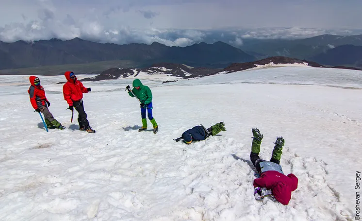 Единственное, что нас расстраивало — это прогноз погоды. Он был не утешительным. Только с 7 на 8-ое июля была более менее подходящая погода, чтобы взойти на вершину, в остальные дни большое количество осадков и сильнейший ветер. Но до 7-ого числа еще было далеко. Следующий день в штурмовом лагере проходил под эгидой «знакомство с железками и как ими пользоваться». Мы пошли на снежно-ледовый склон Эльбруса учиться (Мы с Серегой учить, а остальные учиться) пользоваться кошками, ледорубом, связываться и идти в связке, зарубаться на льду и снегу.