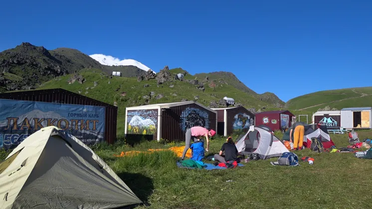 На 3800 метрах располагается штурмовой лагерь Эльбруса с севера. Тут огромное сосредоточение палаток и домиков. Практически все, кто поднимается на Эльбрус с севера выходят ночью именно отсюда. Здесь мы оставили часть продуктов (большую), которая понадобиться нам для жизни в лагере, походах на акклиматизацию и на саму вершину. На обратном пути мы пошли по более длинной дороге через, так называемые, «Грибы».