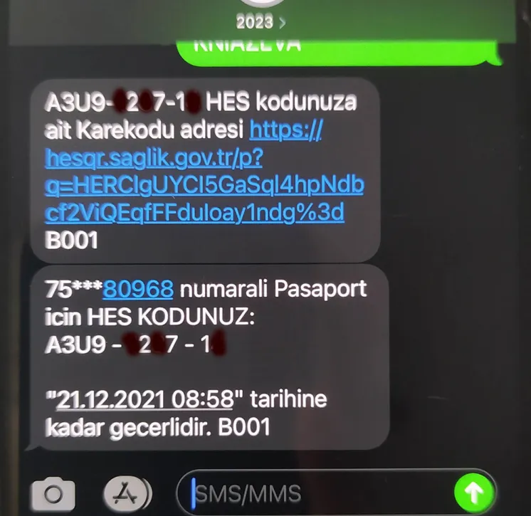 С начала осени 2020-ого года по всей Турции гражданам, а также туристам необходимо иметь код здоровья или HES-код. Он делается только гражданам Турции или иностранцам, которые прилетели или заехали в Турцию, то есть прошли границу и имеют штамп о въезде. Чтобы сделать HES код нужно отправить с местной сим-карты (с российской не получится) на номер 2023 следующее смс: