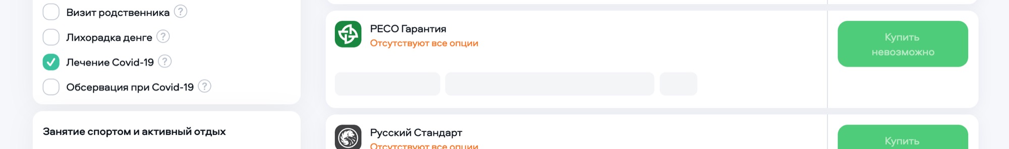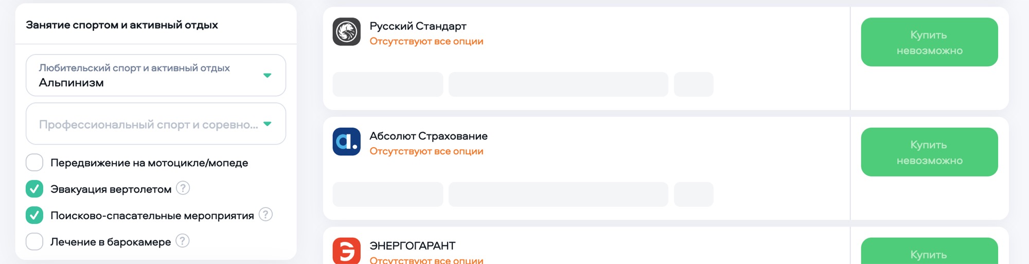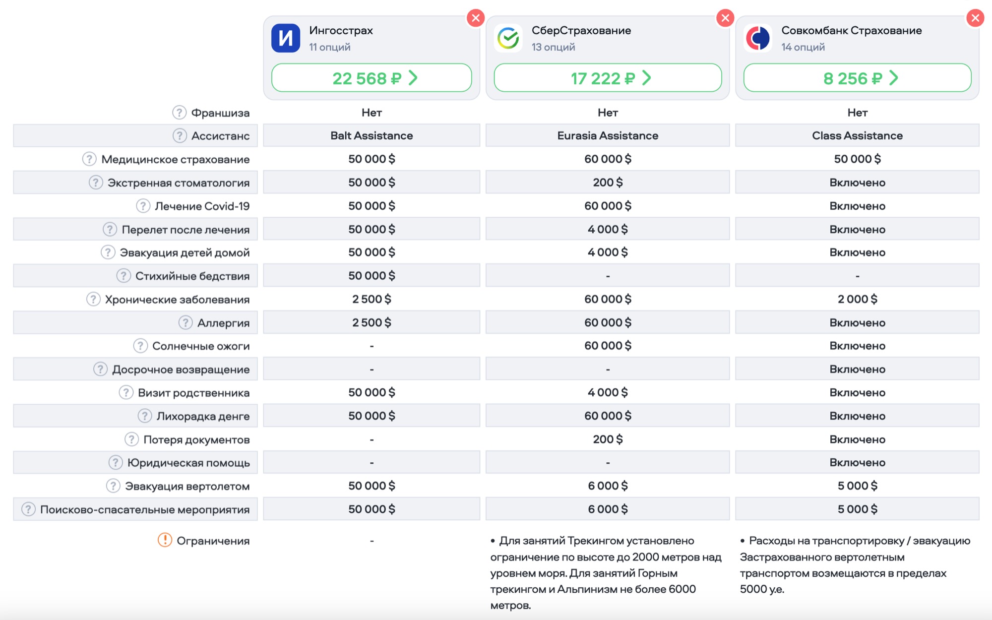 Добавляем в Сравнение все 3 страховые компании и сравниваем. Видно, что у Совкомбанк ограничение в 5000$ на эвакуацию вертолётом, а нам нужно 50000$. У Сберстрахования видим ограничение по высоте - 6000м. У нас же будет 6960м. Среди наших вариантов остаётся только один - Ингосстрах. Нажимаем на стоимость - Купить