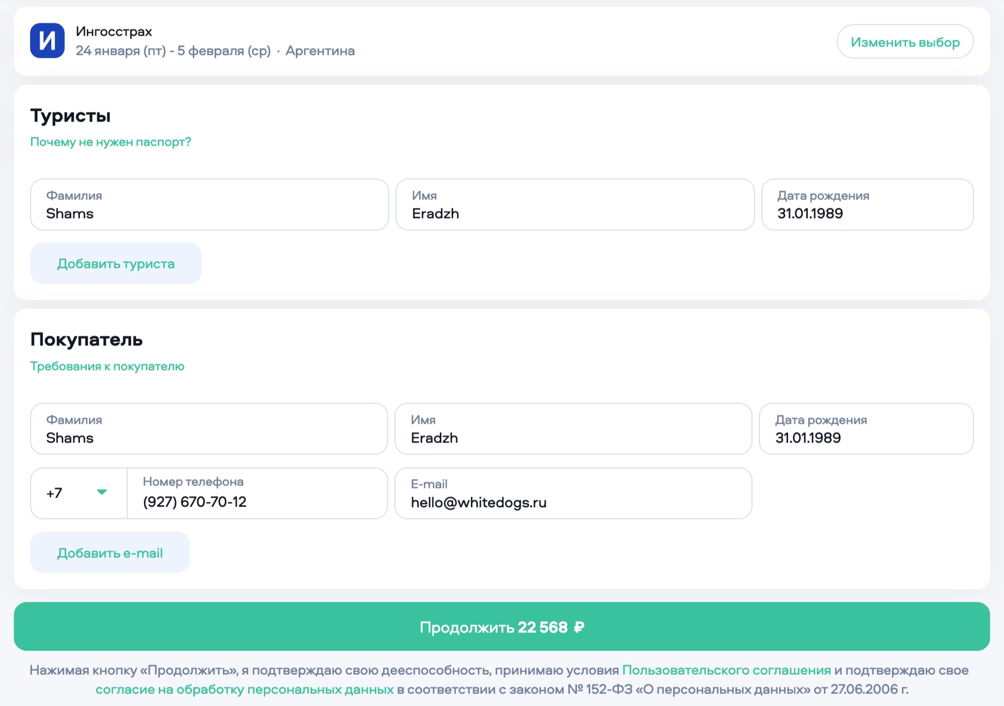 Вводим своё Имя Фамилия как в загране, дату рождения, телефон и email. Нажимаем Продолжить
