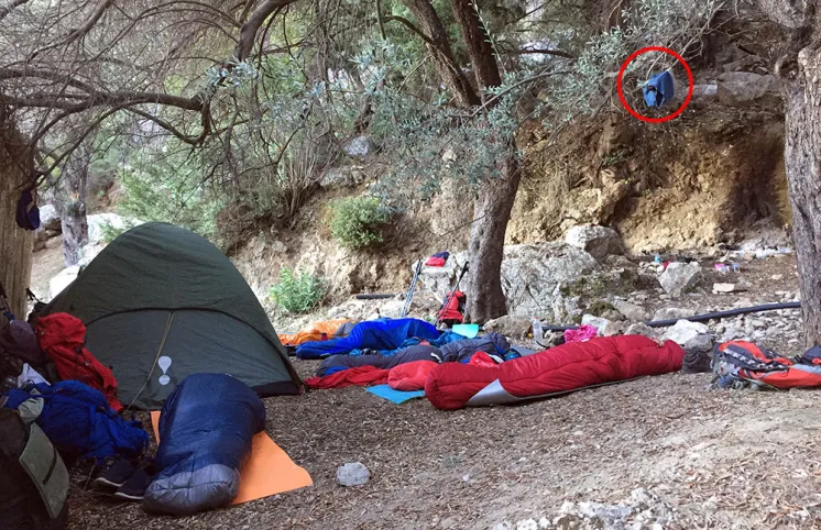 и недалеко от родника Серега увидел дерево обвитое лозой винограда. Недолго думая, я забрался на это дерево и стал сбрасывать гроздья Сереге. Набрали на всю компанию с излишком. Ну и через 10 минут уже ставили лагерь. Вот метка лагеря у подножия Баба-Дага