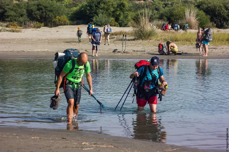 На третий день похода кажется, что мы ходим уже неделю, а все люди в команде - твои старые друзья. Поход объединяет. Неспешное утро с вкусной кашей, кофе и печеньками. Но нужно трогать в путь. Сегодня нас ждут два обалденных пляжа, на одном из которых мы пообедаем, а на другом заночуем. Пообедали мы на пляже возле села Кабак