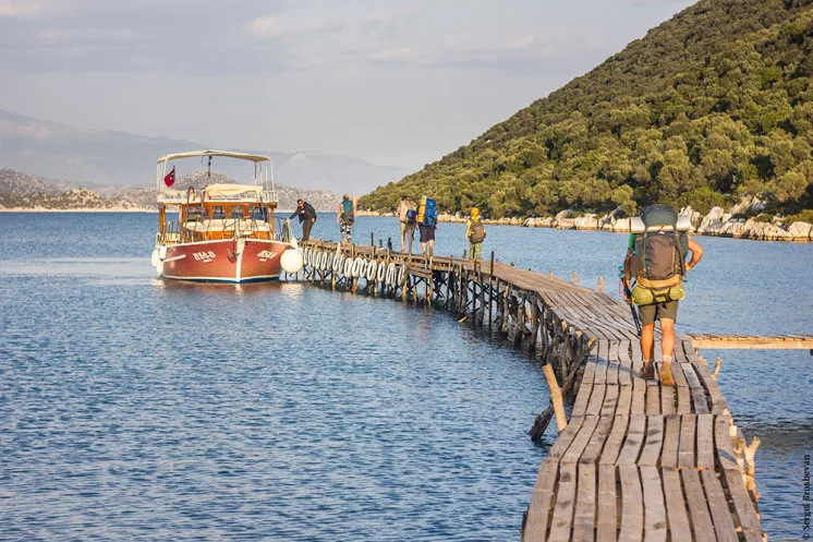 В первую половину дня мы прошлись по берегу Средиземного моря, постоянно купаясь и загорая. Валуны на тропе и сам пляж вулканического происхождения. Смотрится красиво, но в воде эти камни режут ноги и заходить в воду не очень комфортно. Вот здесь уходим налево на подъем и через 8 километров мы дойдем до древних руин Ликийского города Аперлаи. Осматриваем город, переходим до пристани, заранее договорившись, чтобы из Учагыза за вами приплыла лодка.