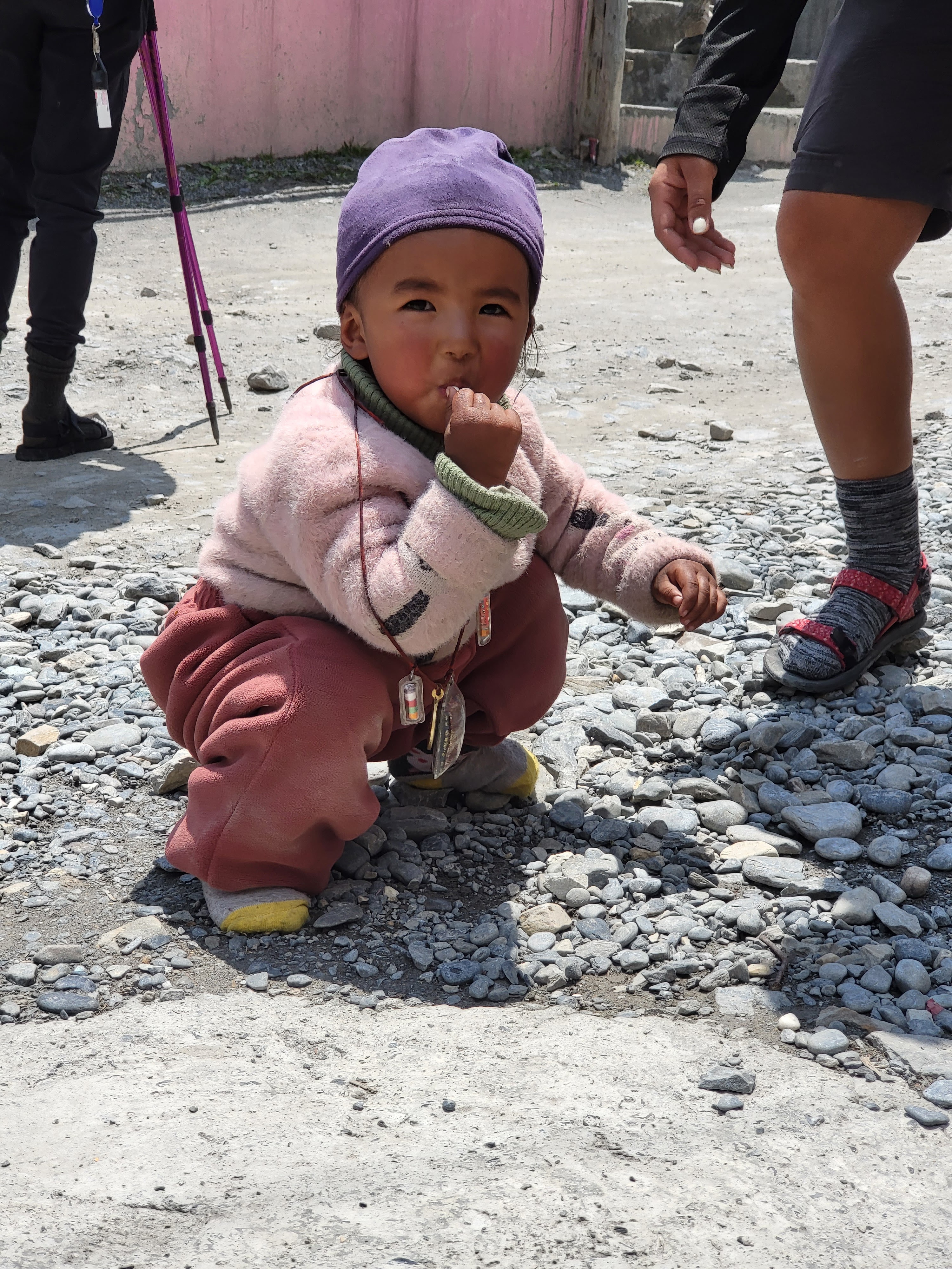 Изредка проезжают джипы - несколько лет назад проложили грунтовку до Мананга, где мы будем только на 4-й день пути. Но проезжать этот участок точно не стоит вместо тряски на джипе и быстрых взглядов по сторонам получаешь гораздо больше: идти несложно, пейзажи завораживают, местные улыбаются. Детишки вызывают умиление, некоторые даже просятся на ручки. Чумазые и одетые во что попало, заливаются смехом и складывают руки у груди: Намастеее. Не сразу понимаешь значение этого слова. Это не просто приветствие, это коротенькая мантра, которая несёт большой смысл: "божественное во мне приветствует и соединяется с божественным в тебе", прославление мироздания, частичкой которого является человек. Последнюю букву протягиваешь, даже пропеваешь. Кроме этого слова ничего и не нужно, всё и так понятно.