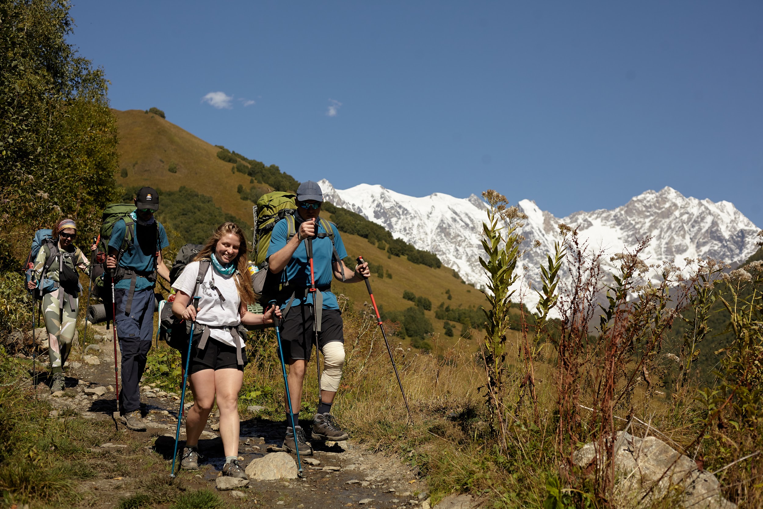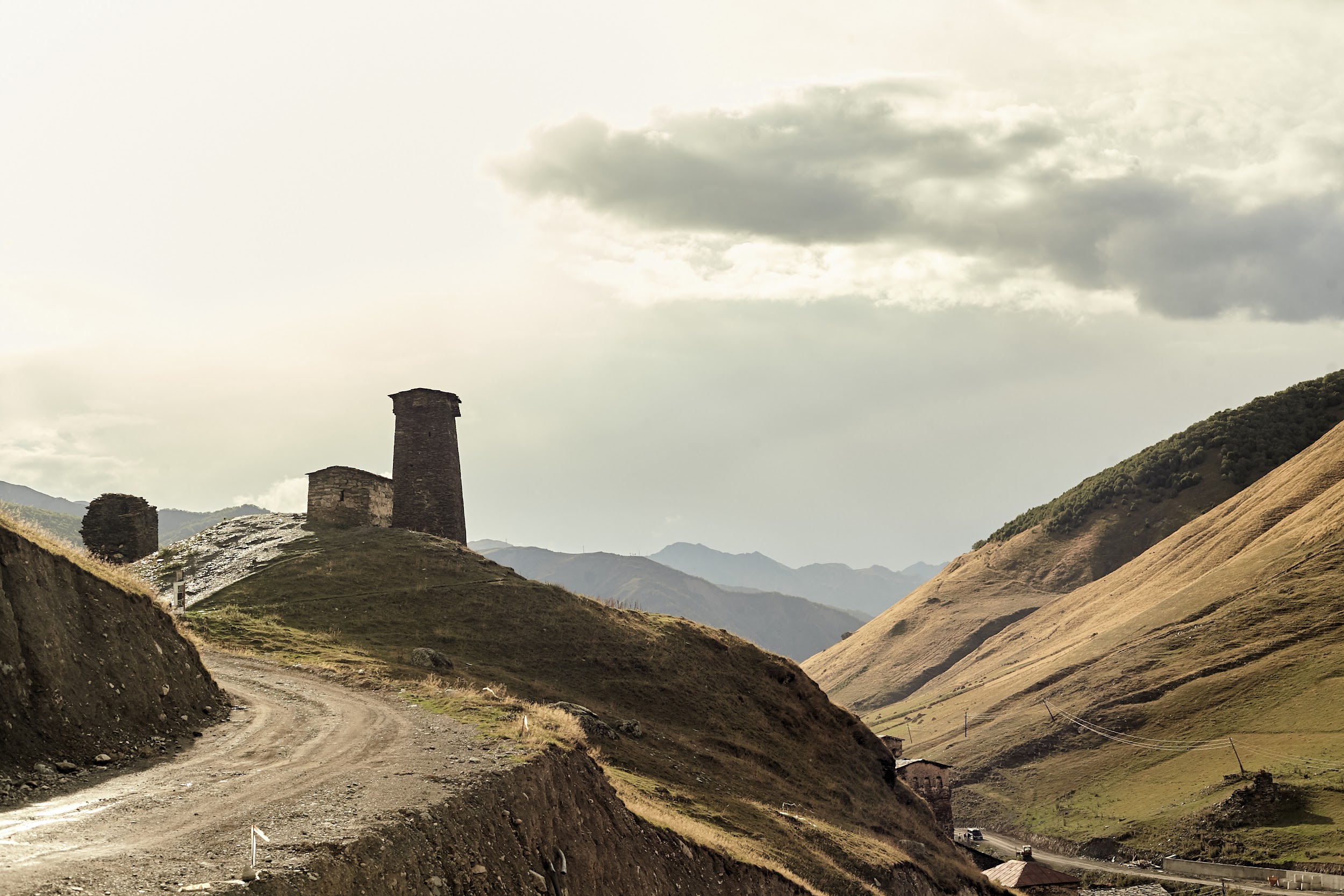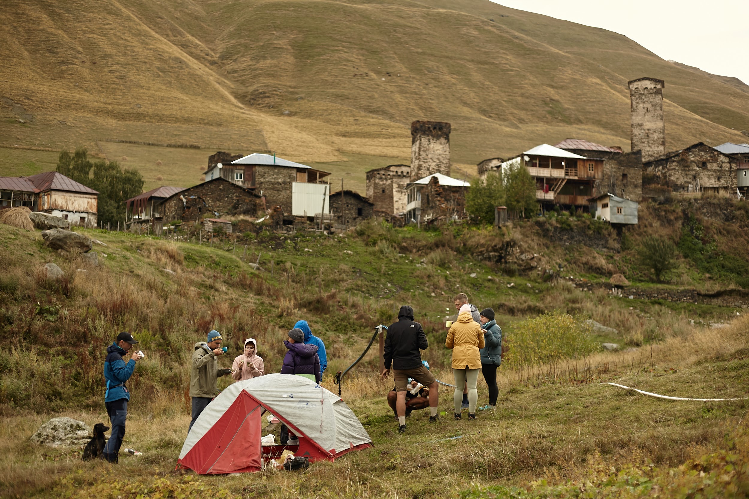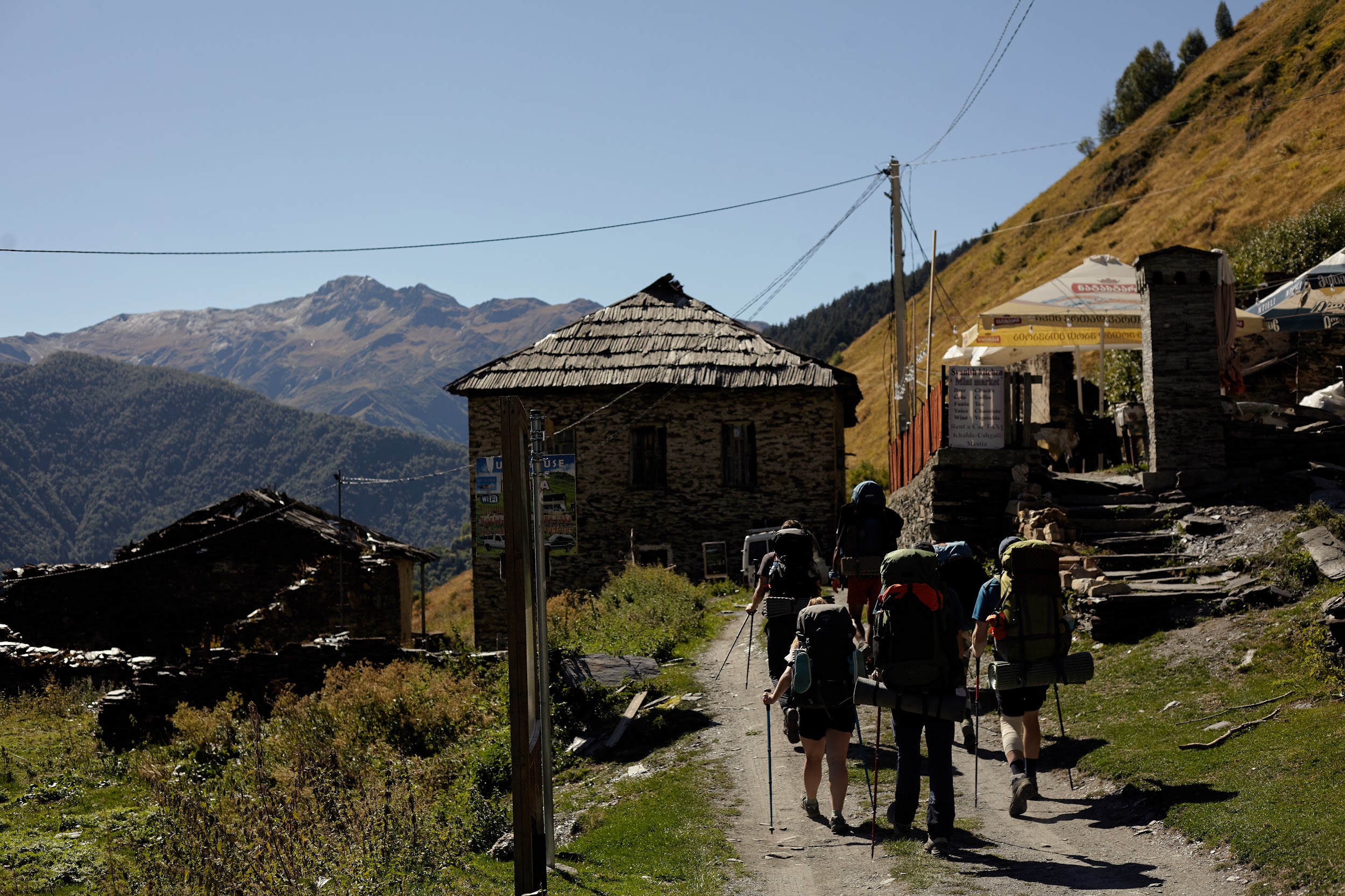 В запасах у нас ещё одна трехлитровая бутылка вина, которая греет наши души. В этот день тропа ведет нас по дороге, но виды все также не подводят, а лишь заставляют останавливаться каждые 100 метров, чтобы сделать фото сванских башен.