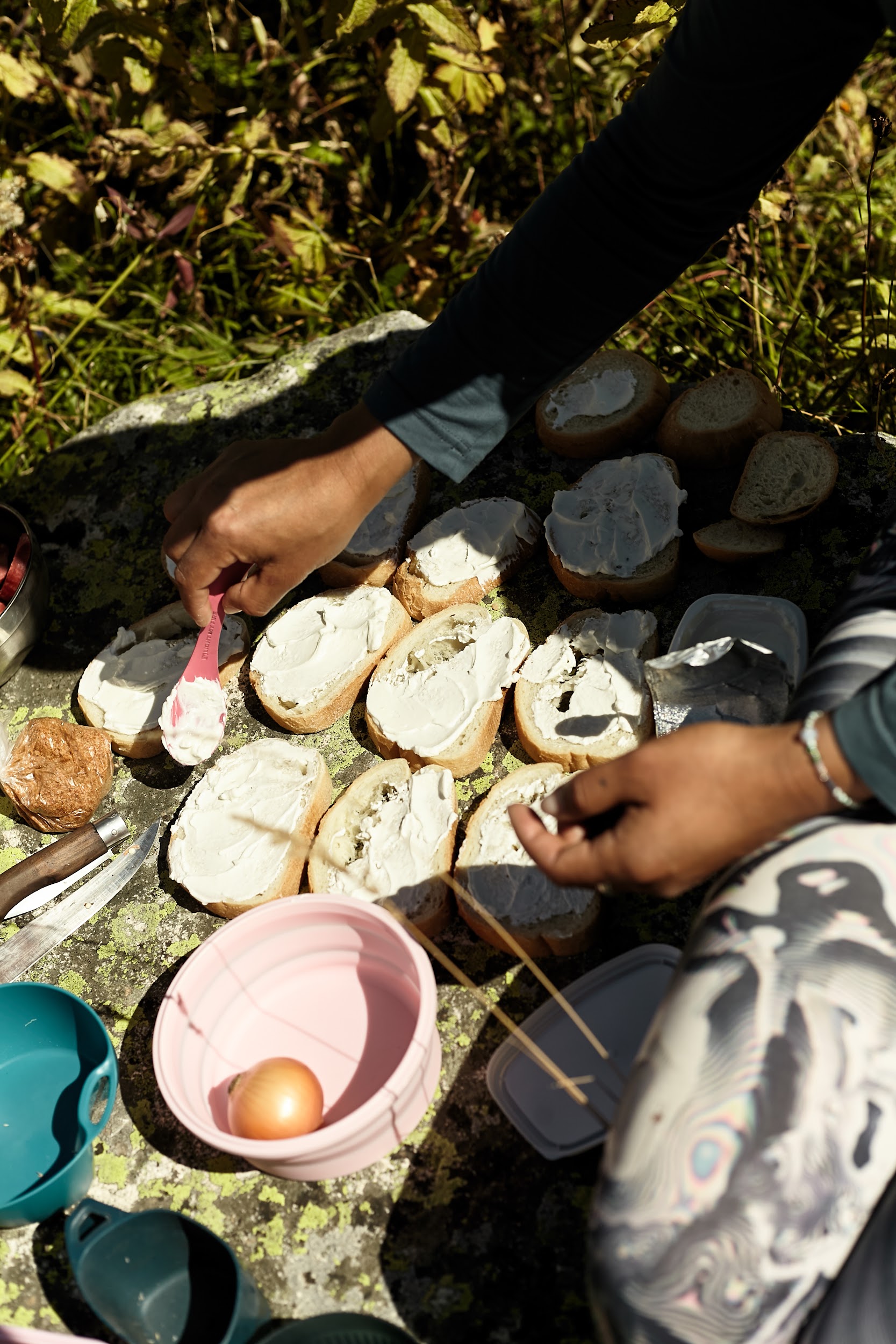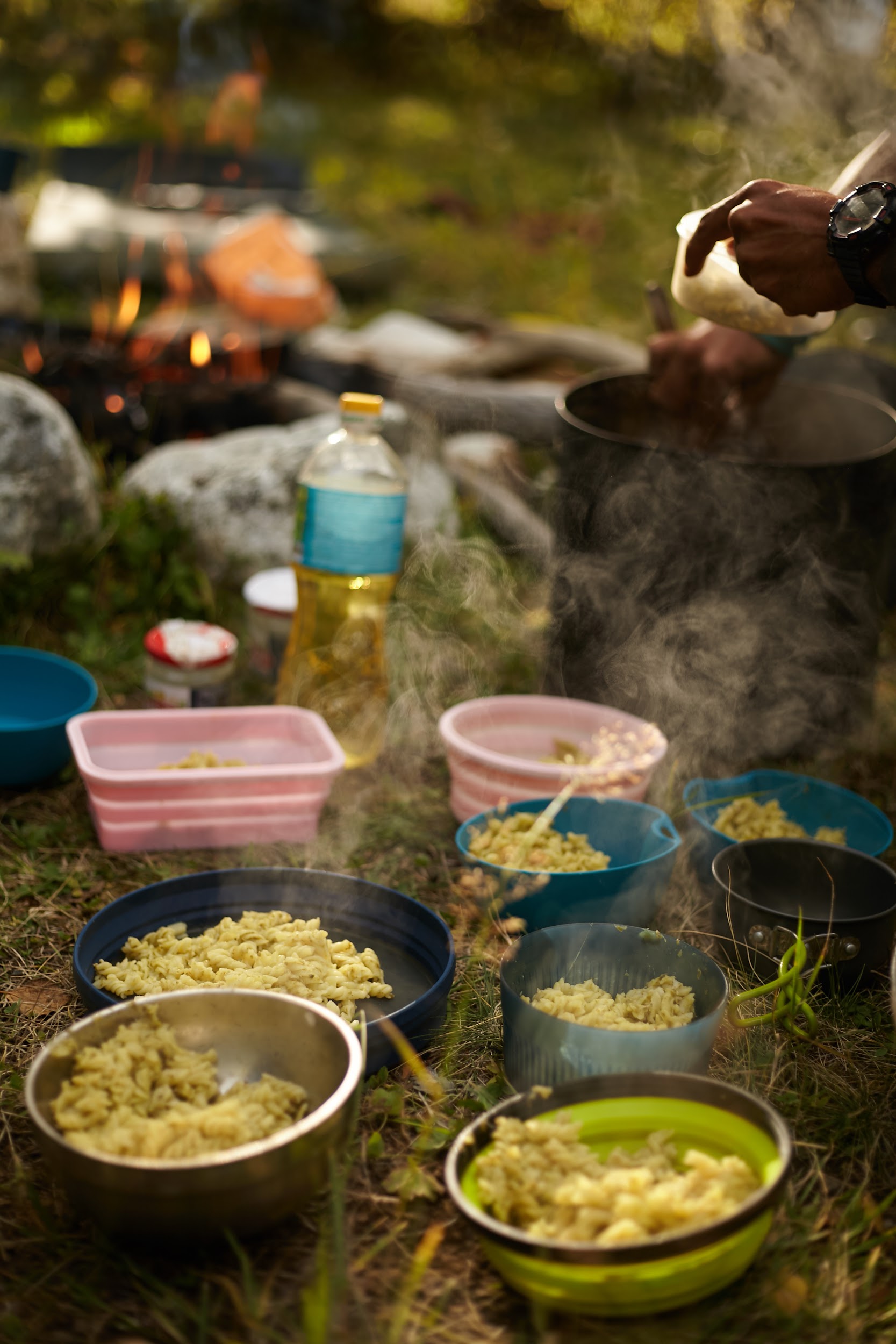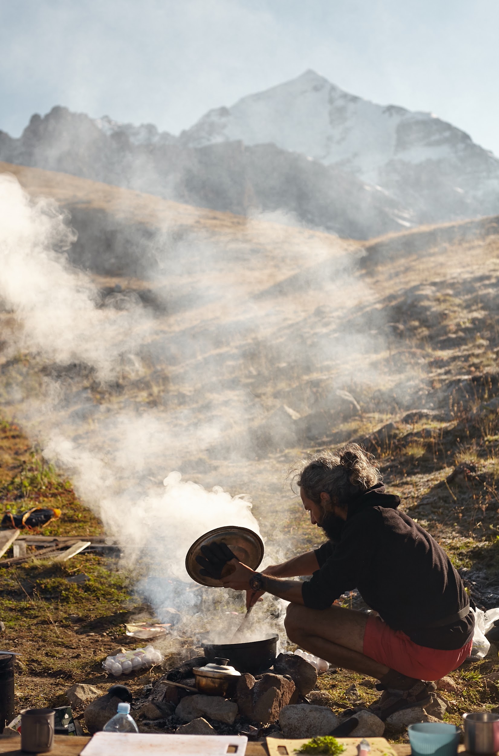 Встали лагерем на острове среди берез. Обычно здесь растет много грибов, удачный улов мы отметим вкуснейшей пастой с песто, сыром и грибами. Стоим около поселка Адиши (2100м). Перекусили