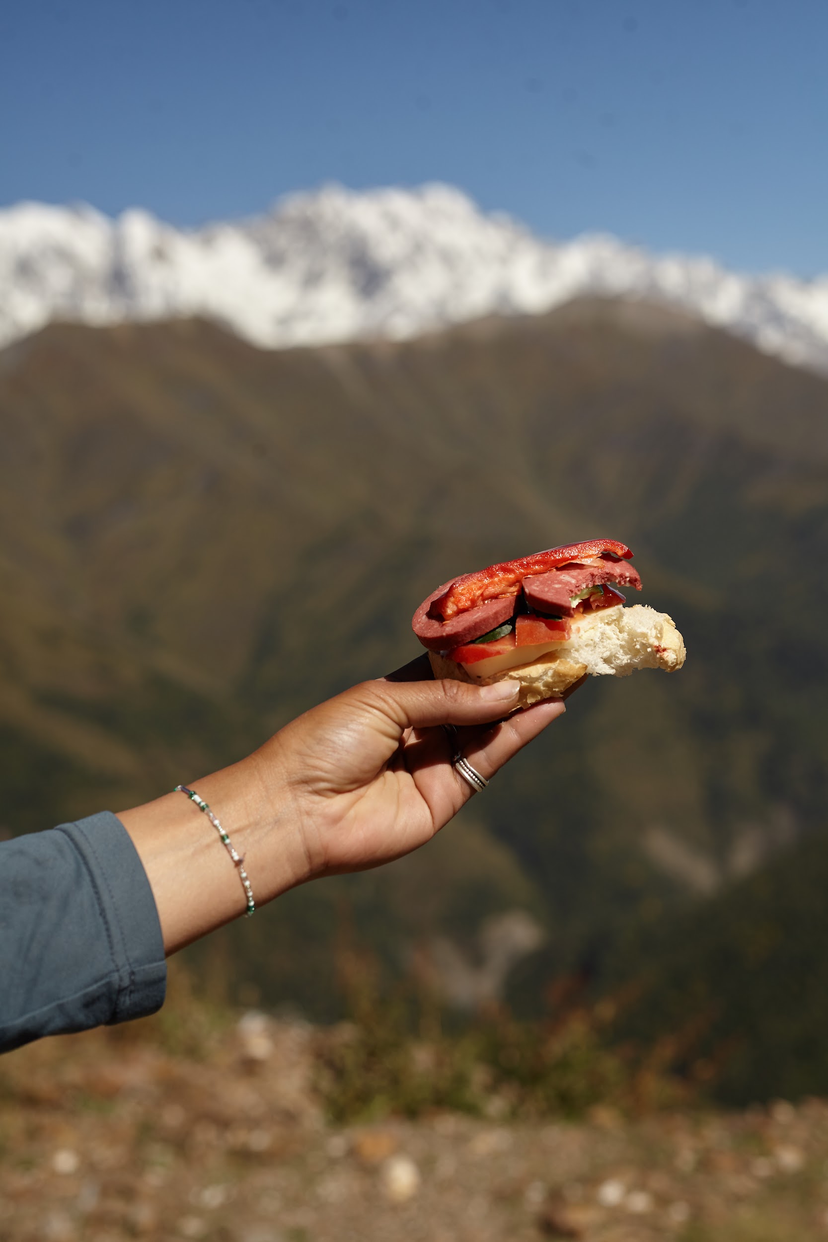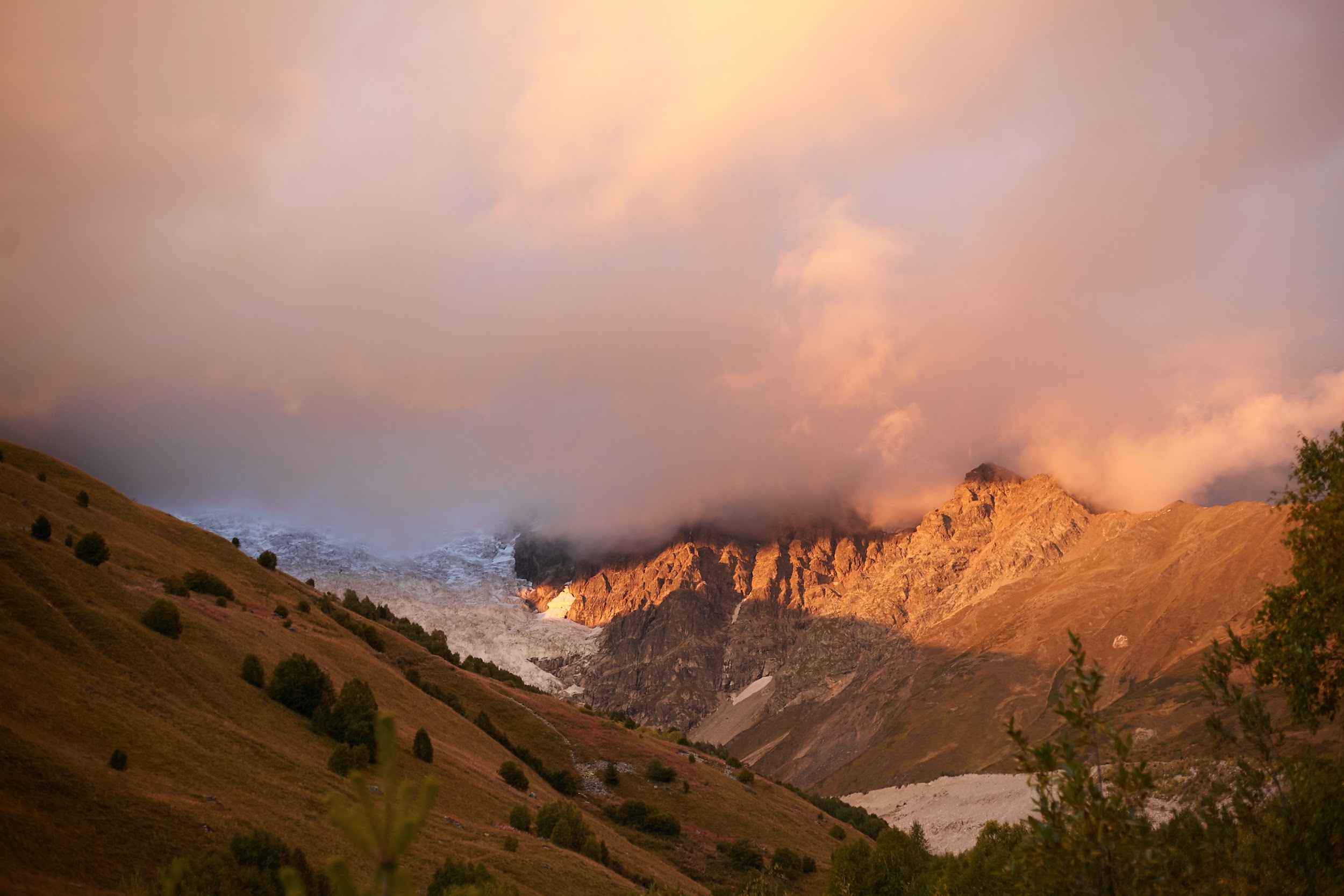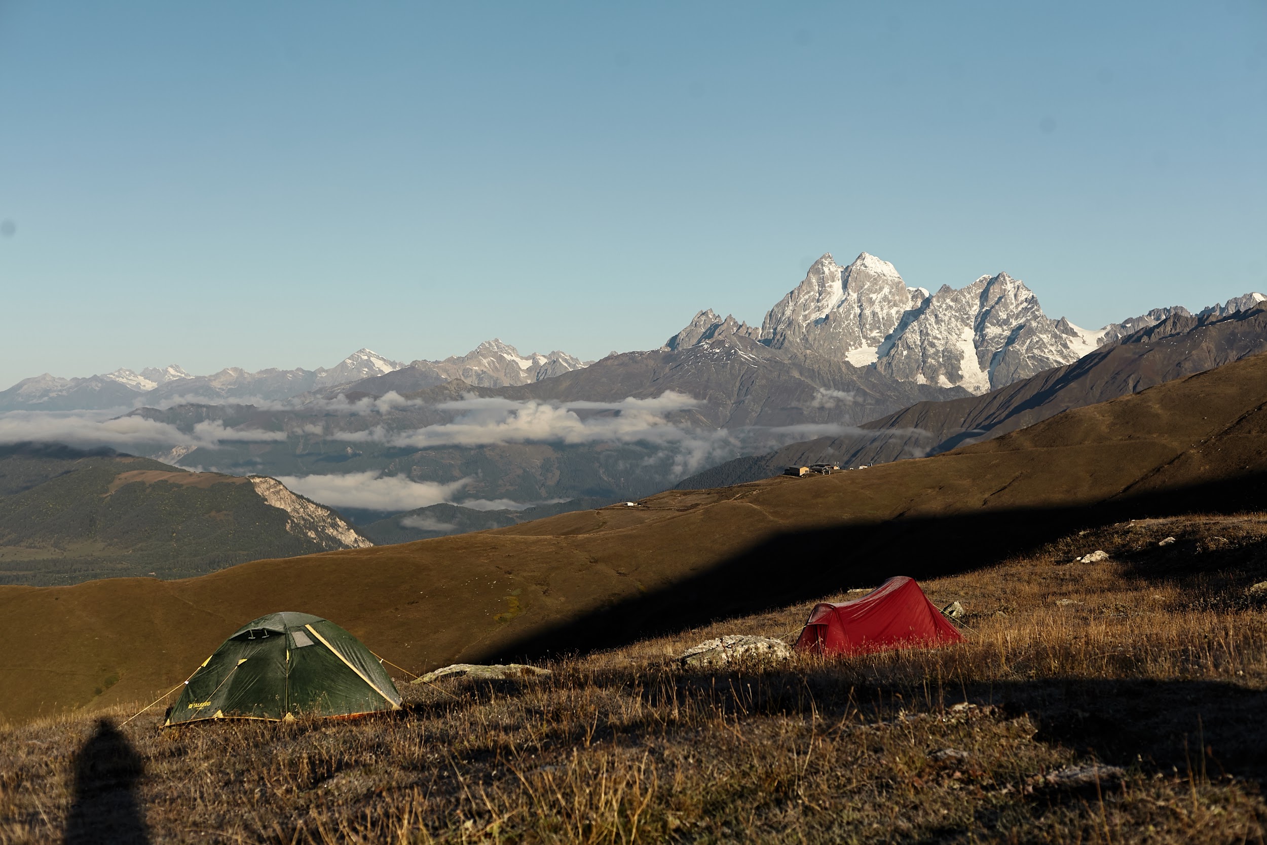 Проснулись мы на рассвете, когда ещё не было облаков, выглянула Ушба, Тетнульд, в общем, было очень красиво. Особенно в сочетании с вкуснейшим завтраком