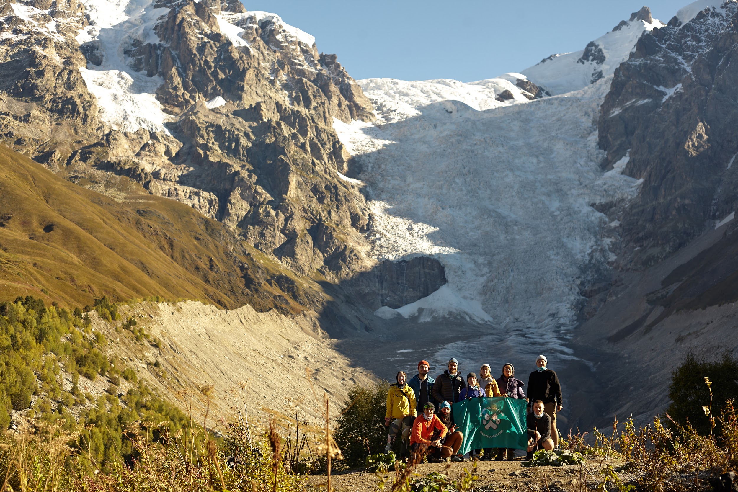 Идем траверсом на перевал, без рюкзаков поднялись ещё на метров 70, чтобы полюбоваться ледником.