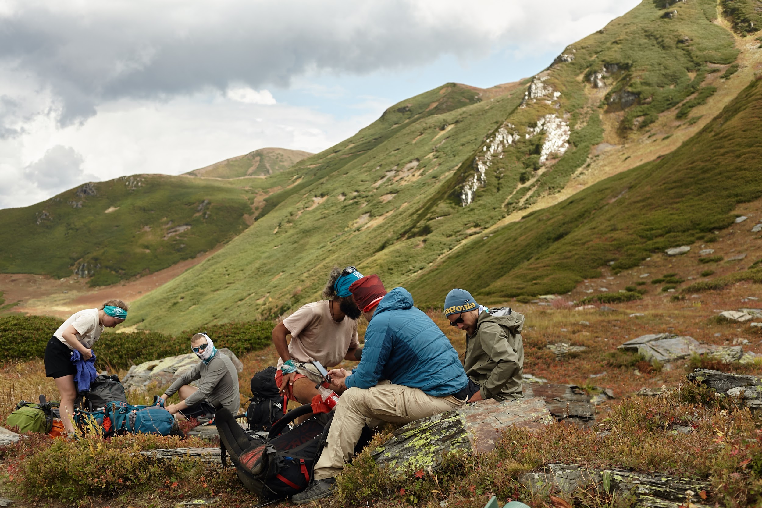 Изначально шли 4 км траверсом вдоль Тендульди, а потом начали спуск по траве,
