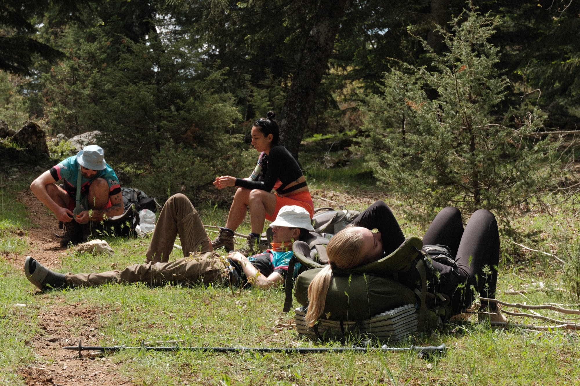 Спуск был великолепный! Не ожидал, что получу такое колоссальное удовольствие на маршруте, предыдущие пять дней не обещали такого кайфа, как то, что случилось сегодня. Было скалолазание, сыпуха, скалы сменялись разными видами леса. В какой-то момент свернул не туда и по ковру из иголок, огибая поваленные деревья, вышел к обрыву. Заплутал, что тоже подкинуло пару монет в копилку чистейшего удовольствия. Ощущение, что я животное, которое сломало клетку и оказалось в естественной среде обитания. Запах сводил с ума. Ноги сами выбирали путь, а голова улетела на другую планету. Из сладкого сна вывели Юра с Нари. Группа собирается. Скоро обед!