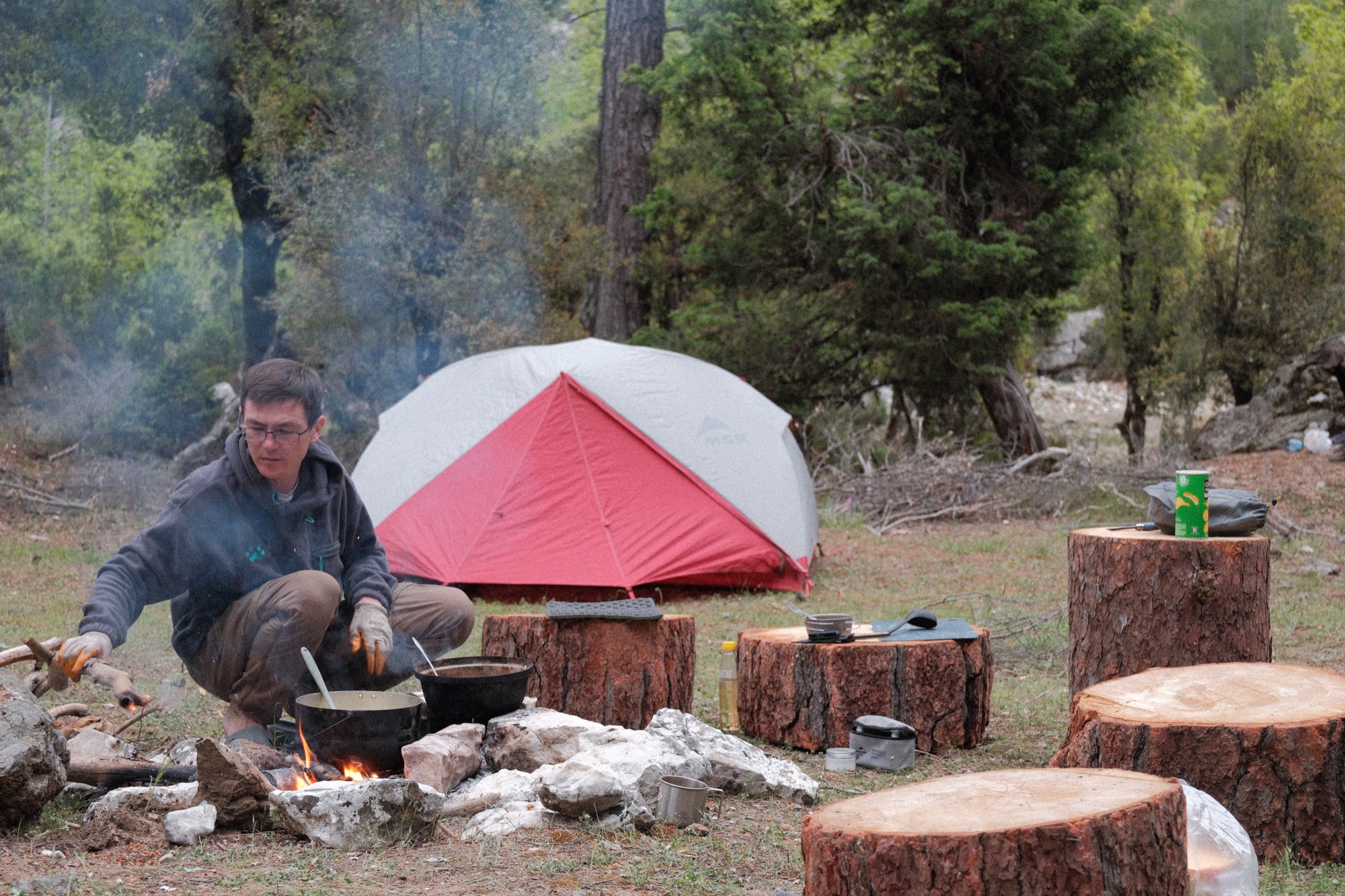 Привальнули у красивого дерева. Вове было тяжело, что он списывал на возраст, а не физическое состояние. Линар, наш дорогой пироман, спалил брошенный турками пластик. Палили всякое в весеннем лесу.