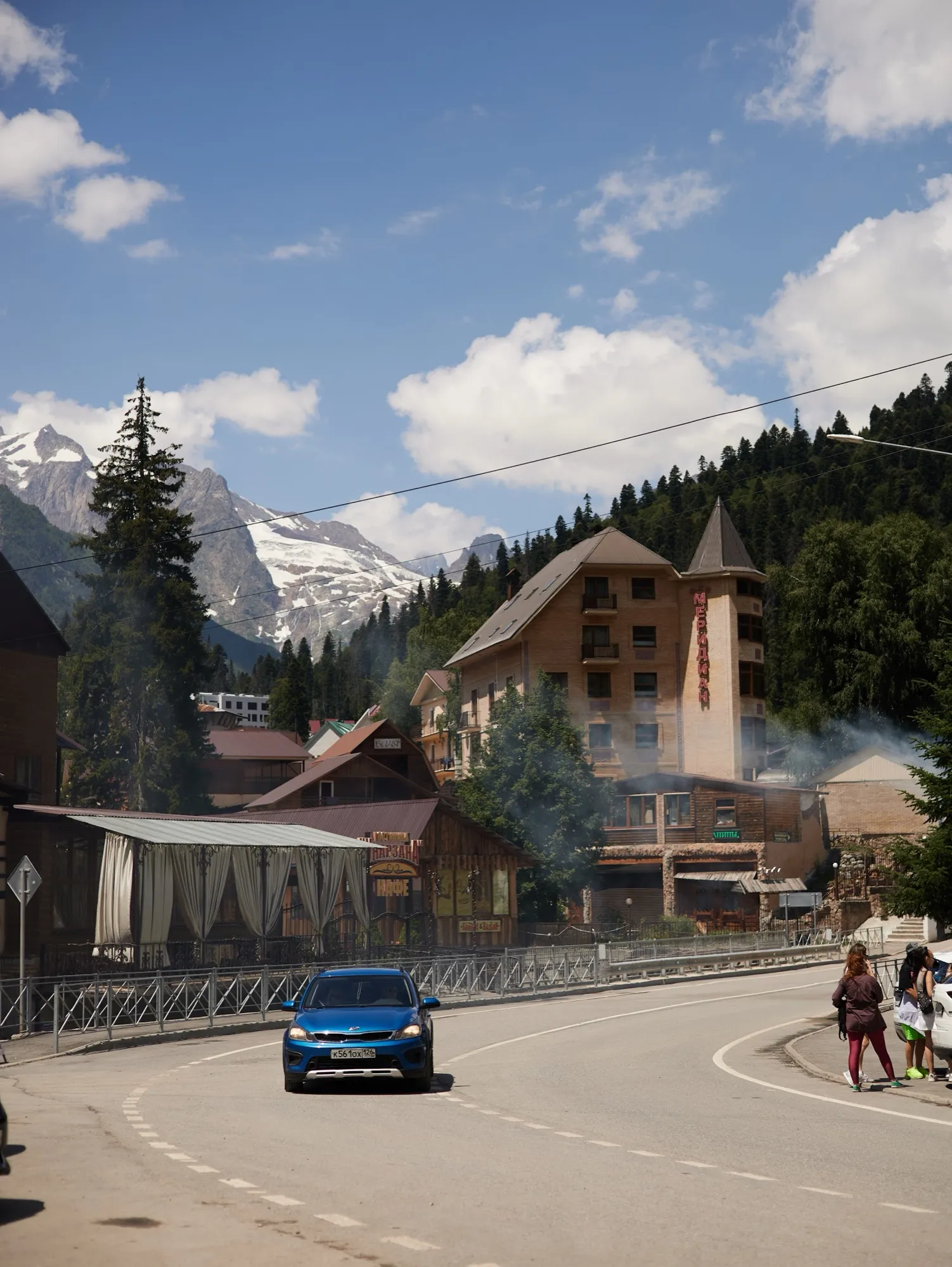 Сегодня отдыхаем. Можно по желанию подняться на канатной дороге до 3000 м, прогуляться к водопадам или просто смотреть на горы. Ночь в Домбае.