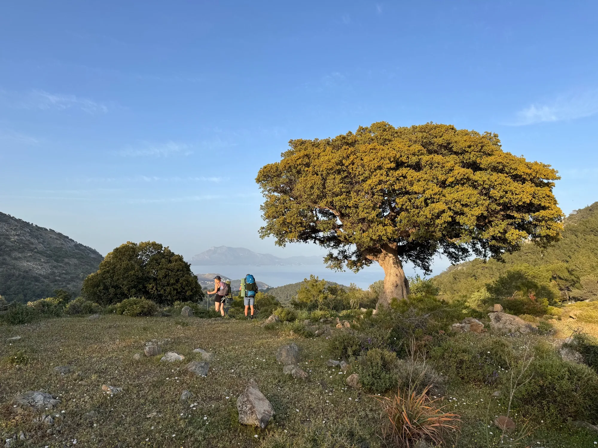 Рано утром завтракаем, грузимся в автобус и едем на старт маршрута. Время в дороге – 1,5 часа. Выходим на маршрут и начинаем путь. Сначала идём по красивой лесной тропе вдоль моря, а затем преодолеваем небольшой перевал. Отличная разминка. Ночуем прямо на пляже в уютной бухточке Домуз Чукуру.