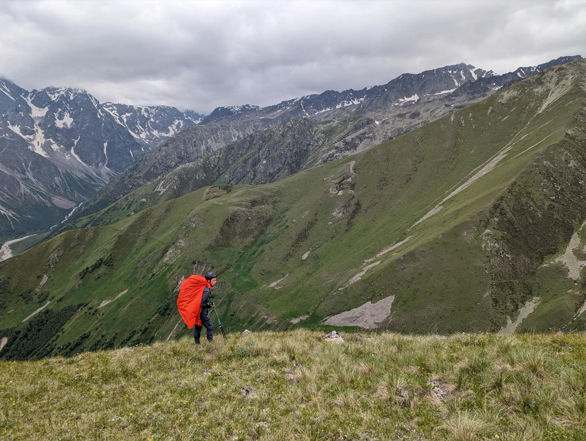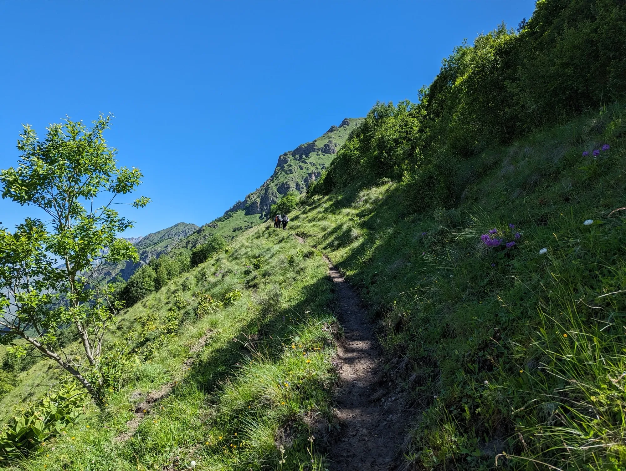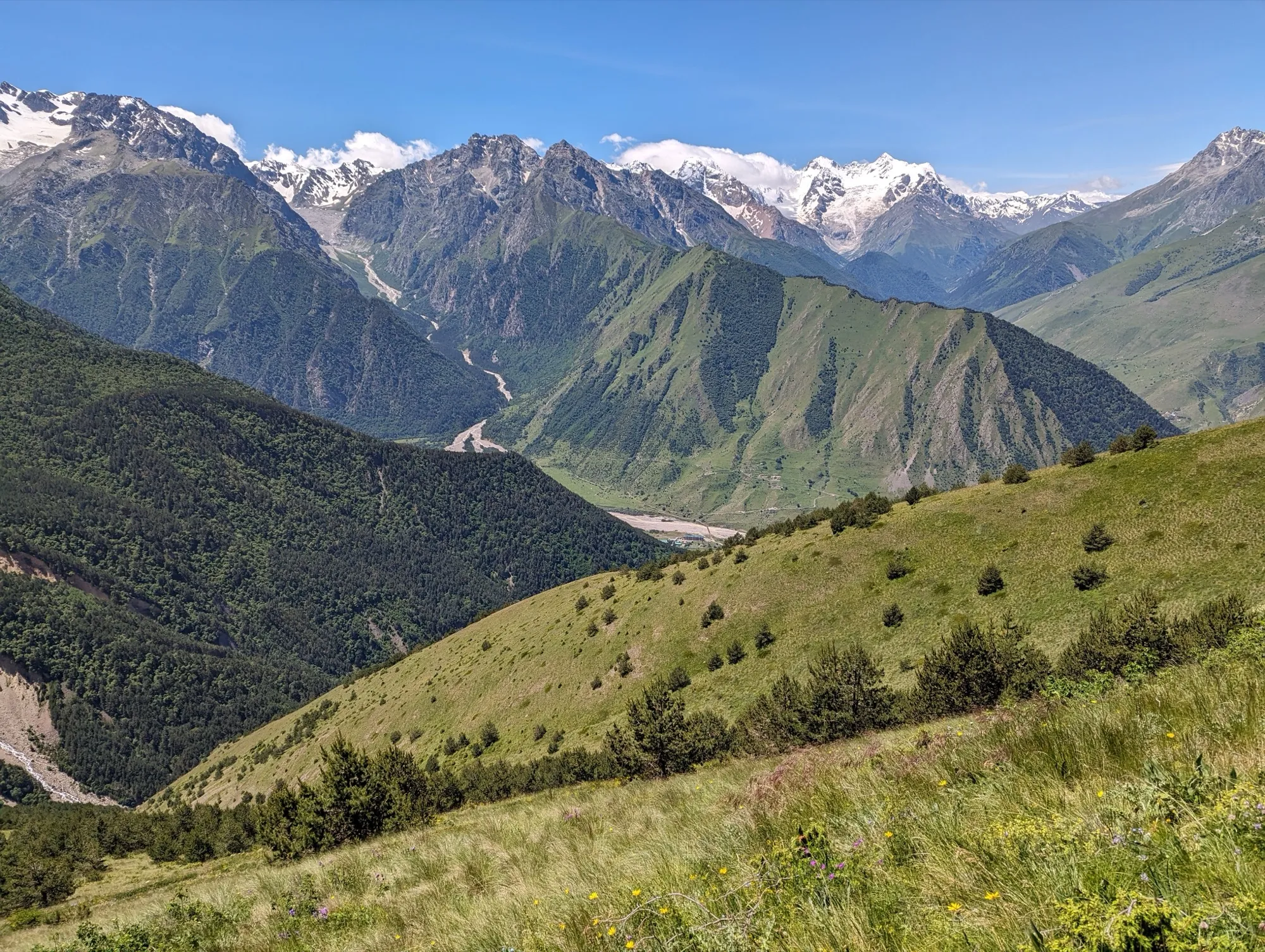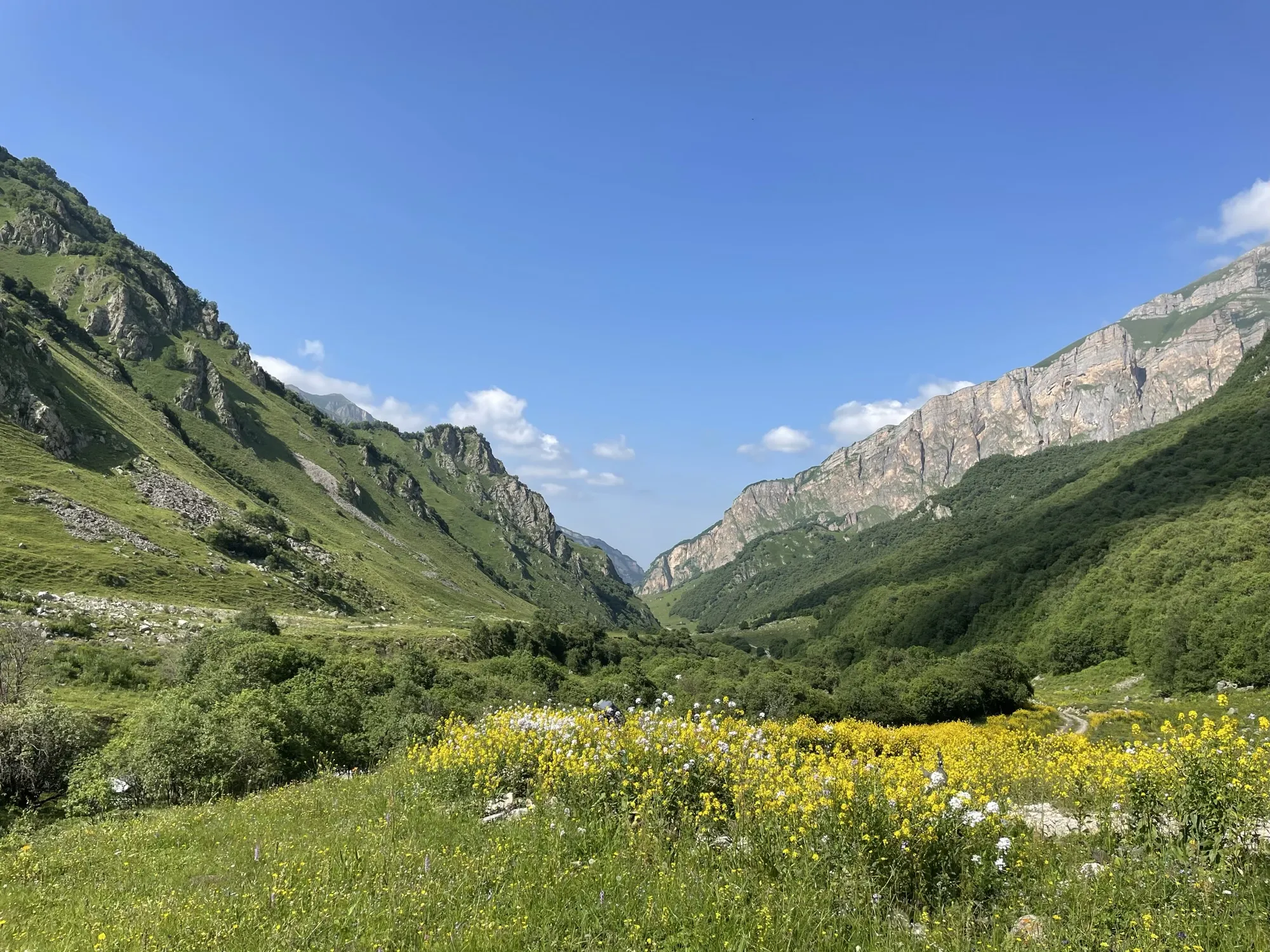 Первая часть начинается в селе Ташлы-Тала (КБР). Мы преодолеем два перевала, где нас ждут насыщенные зелёные пейзажи и яркие цветочные поляны. Завершив этот участок, спустимся в село Дзинага, где устроим дневку. Здесь же, при желании и силах, сможем отправиться к Караугомскому леднику.