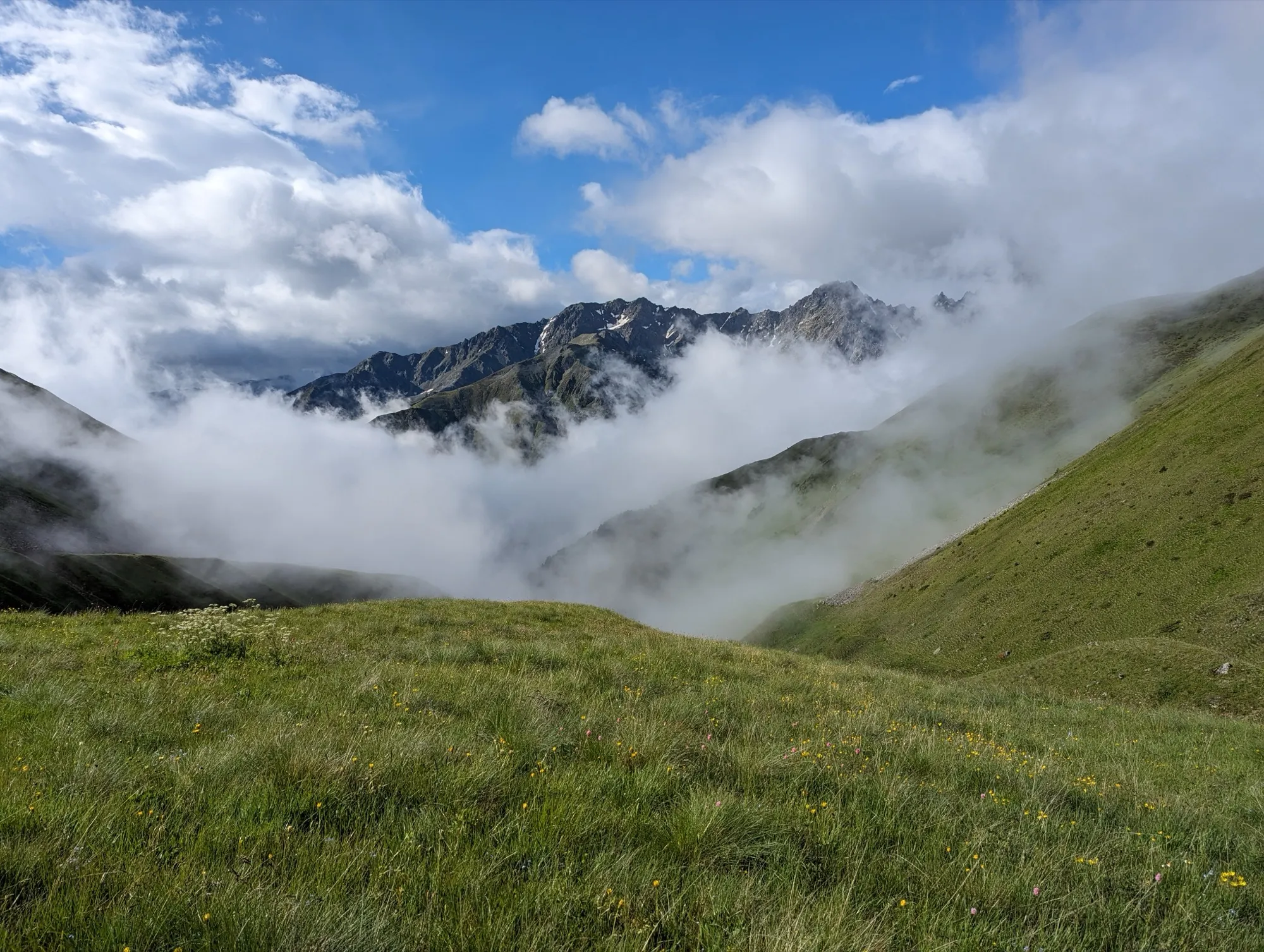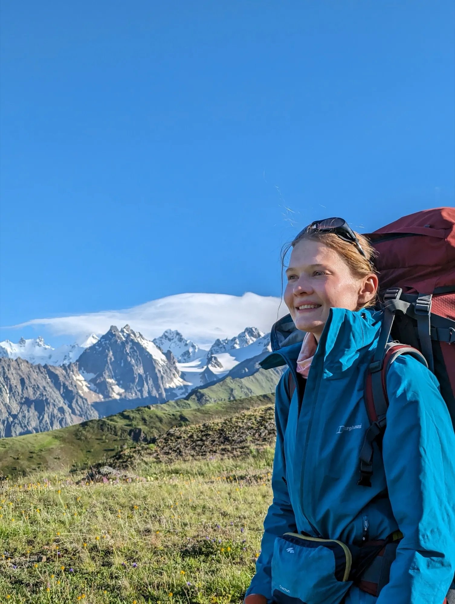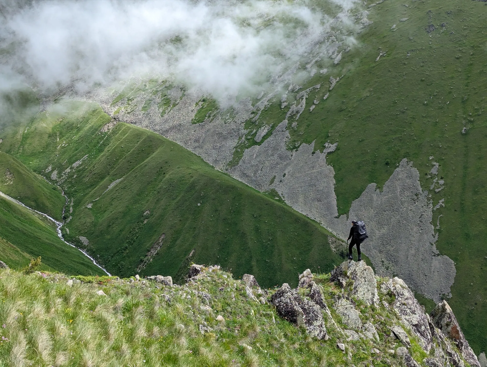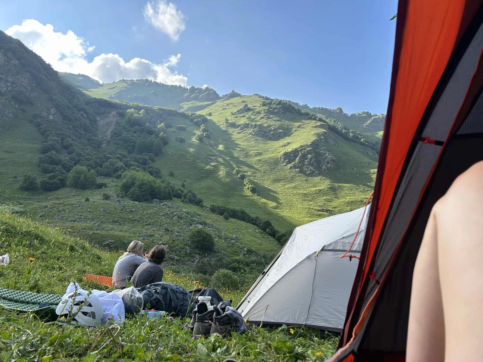 Первая часть начинается в селе Ташлы-Тала (КБР). Мы преодолеем два перевала, где нас ждут насыщенные зелёные пейзажи и яркие цветочные поляны. Завершив этот участок, спустимся в село Дзинага, где устроим дневку. Здесь же, при желании и силах, сможем отправиться к Караугомскому леднику.