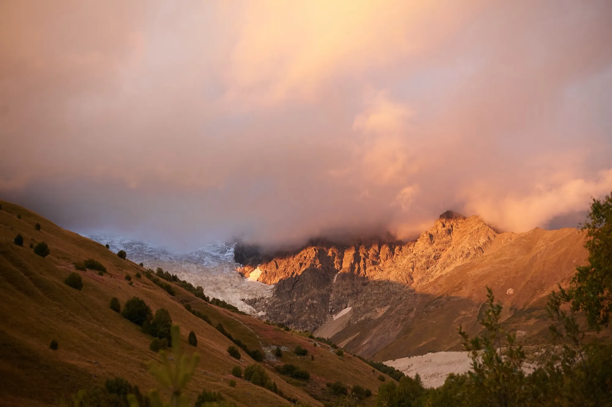 Неспешное утро. Готовим яичницу на костре, пьём кофе с круасанами, собираем палатки и рюкзаки и выдвигаемся. Сегодня потрясающая тропа. На протяжении всего дня мы будем видеть Кавказский хребет прямо рядом с нами. Сзади будет Ушба, слева огромный Тетнульд, а вдалеке будет виднется Шхара.
