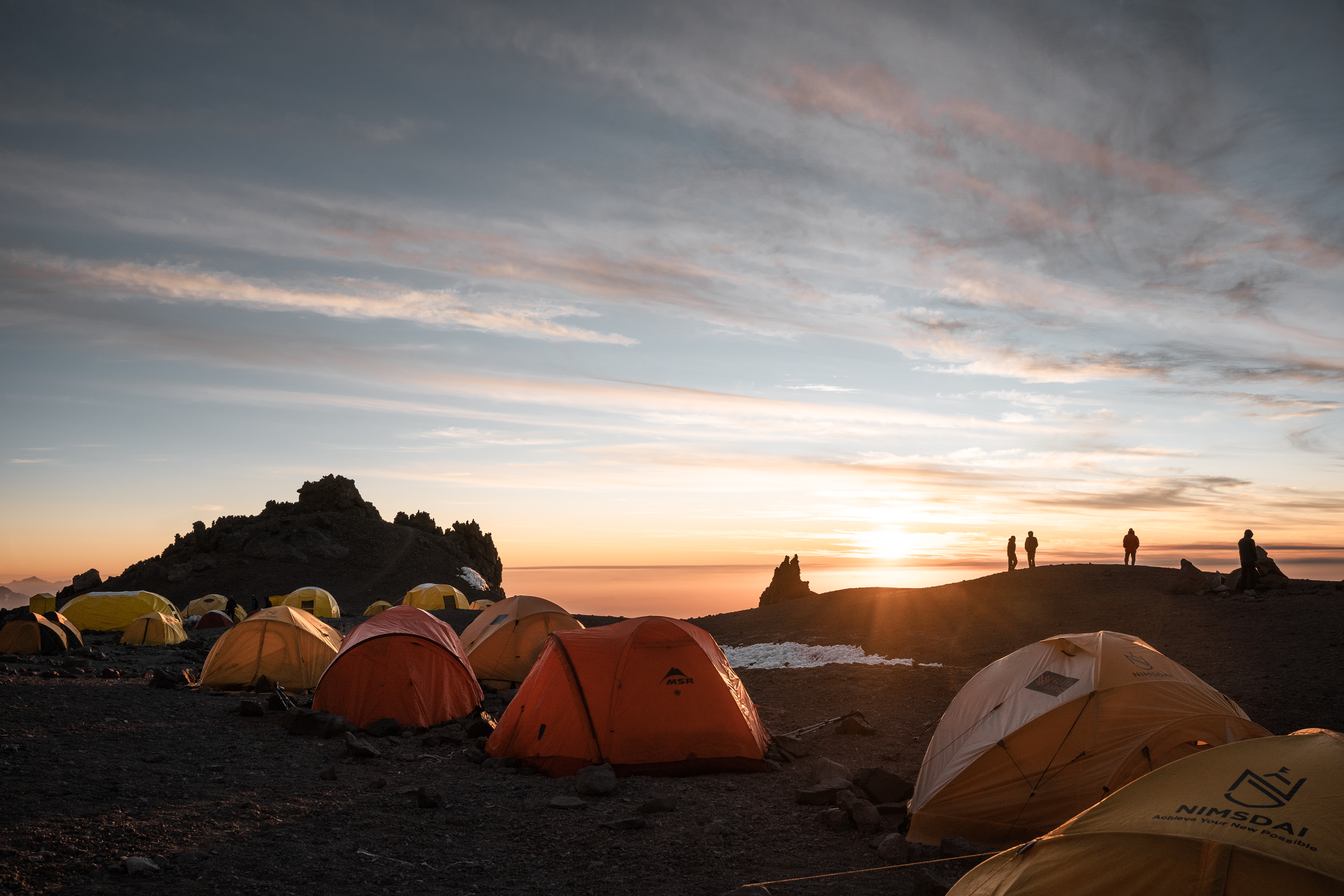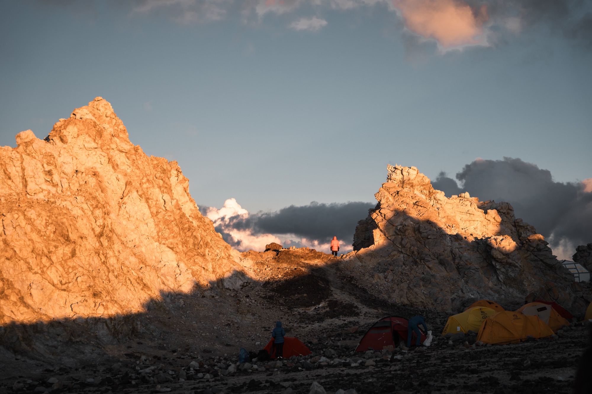 Уже спустя 3 часа после выхода с 4300 мы подходили к лагерю на 5000. Пообедав и немного отдохнув, я оставил ребят и пошёл ночевать на 5500, взяв с собой трехместную палатку, в которой мы будем ночевать в верхних лагерях. Придя в лагерь и поставив палатку, я приготовил ужин и встретил умопомрачительный закат. Погода была шикарной, ни ветра, ни облаков. У ребят тоже был обалденный вид: