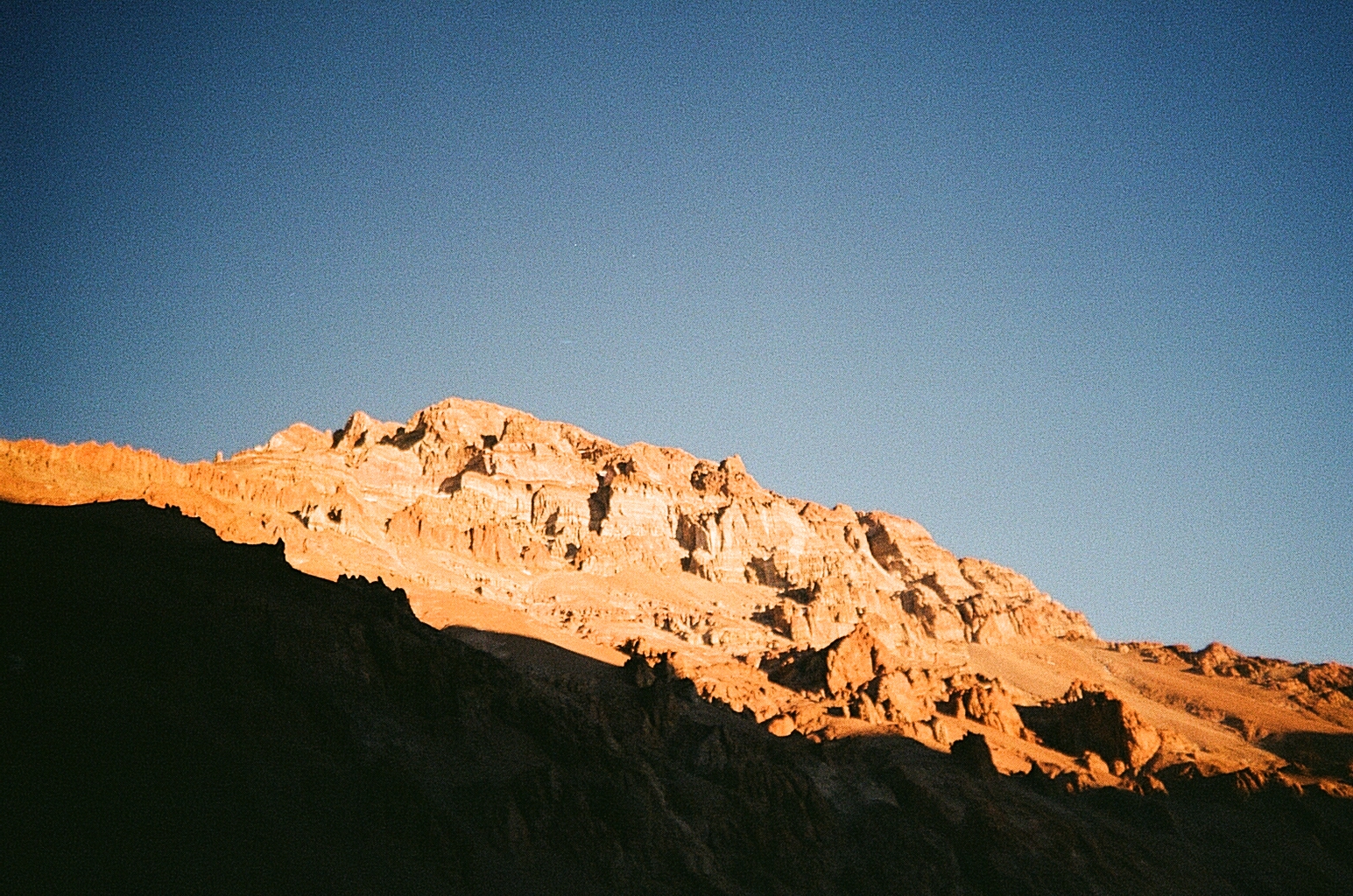 2 часа ночи. Подъём. Костя с трудом надевает ботинки, на горе уже виднеется вереница фонарей. Кто-то вообще только спускается с прошлой ночи. Они уже сутки на высоте более 6000 метров. Тревожно. Кромешная тьма и только тусклый свет фонарика себе под ноги создаёт ощущение жизни. Долгий серпантин наверх. Когда начало светать мы уже были на высоте 6600 метров. Мы настигли группу американцев. Как раз в это время Слава достал фотоаппарат: