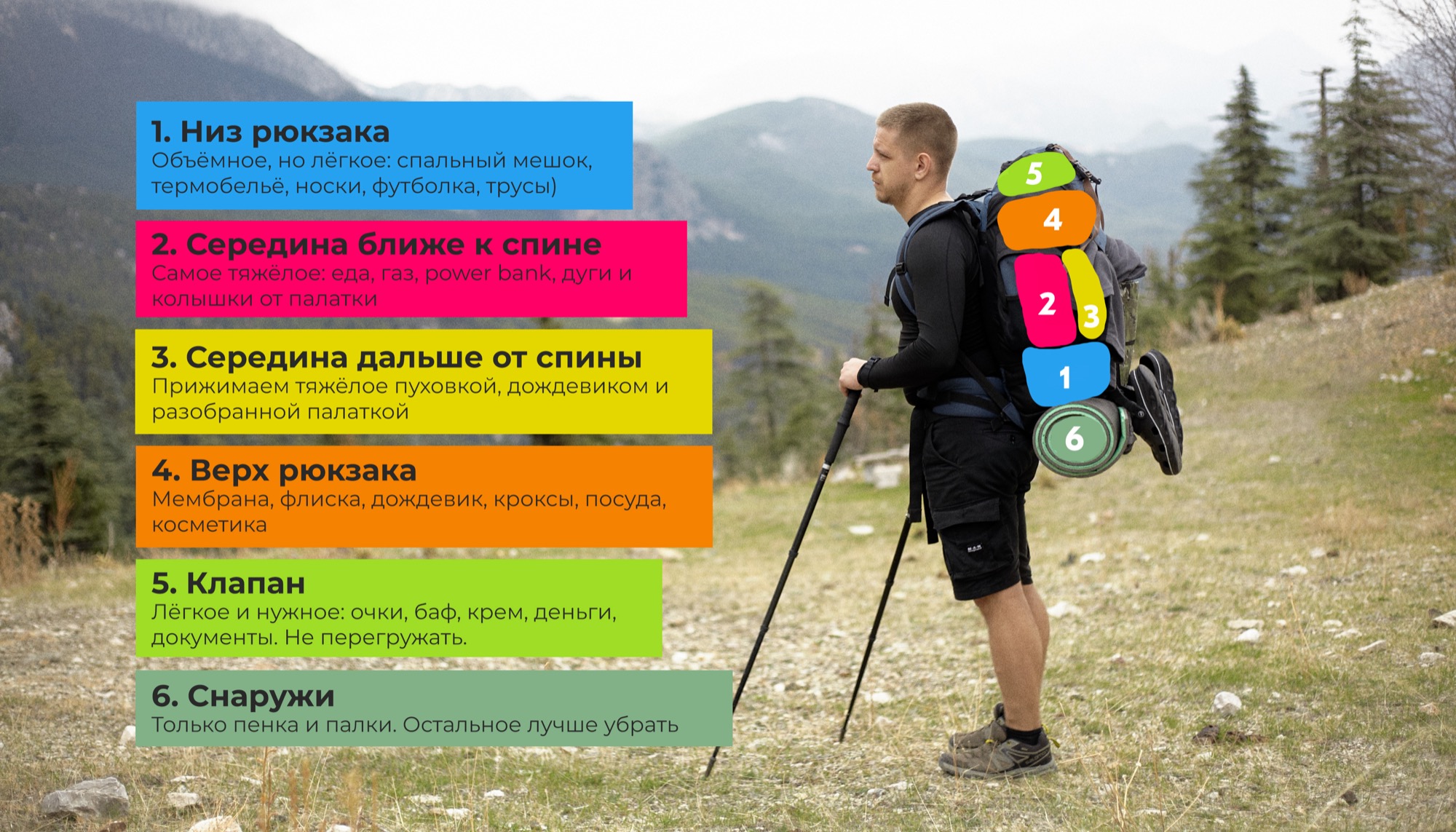 Если всё помещается в рюкзак - супер, но, как правило, пенка (каремат) и трекинговые палки не вмещается внутрь. Их можно закрепить специальными креплениями снаружи рюкзака. Больше ничего снаружи крепить я не рекомендую, так как очень часто эти вещи теряются (зацепятся за ветки, просто отпадут)