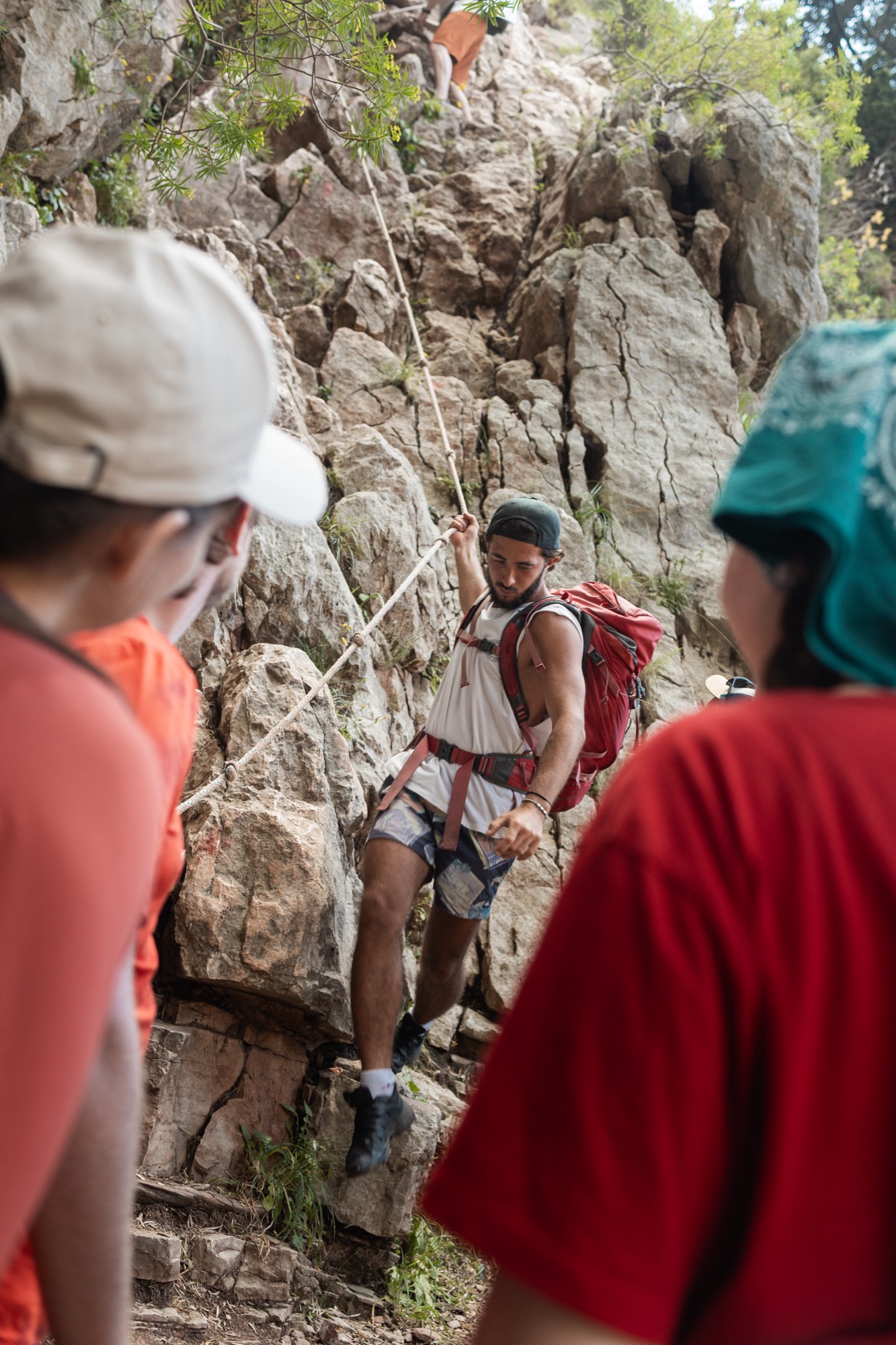 • Спускайтесь всегда лицом к скале и на ногах: то есть, держите двумя руками верёвку выше головы и медленно как по ступенькам ставите ноги на камни
