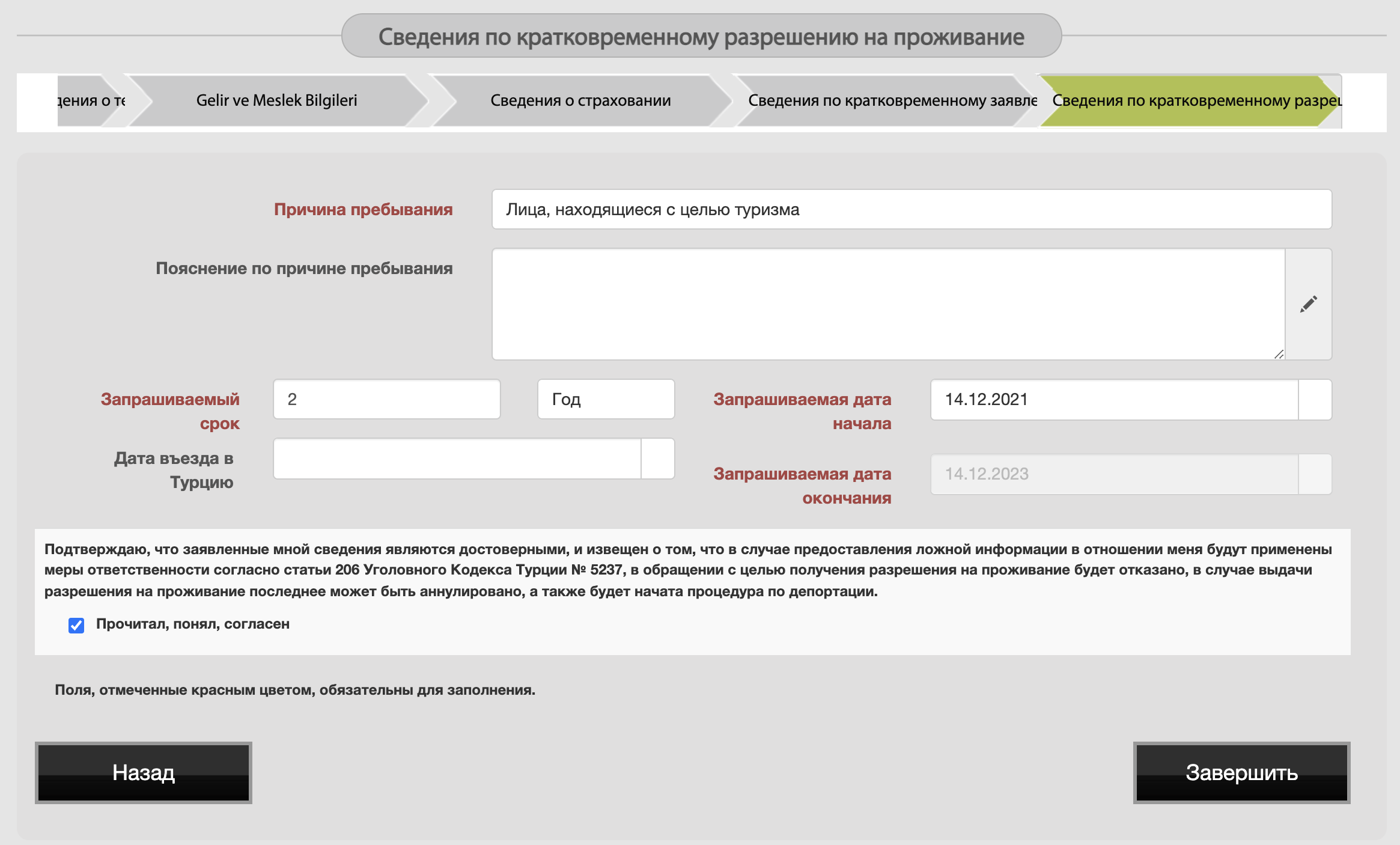 4.16 Причина пребывания - туризм. И вот здесь можно указать желаемый период действия ВНЖ. Прочитал, понял, согласен и “Завершить”
