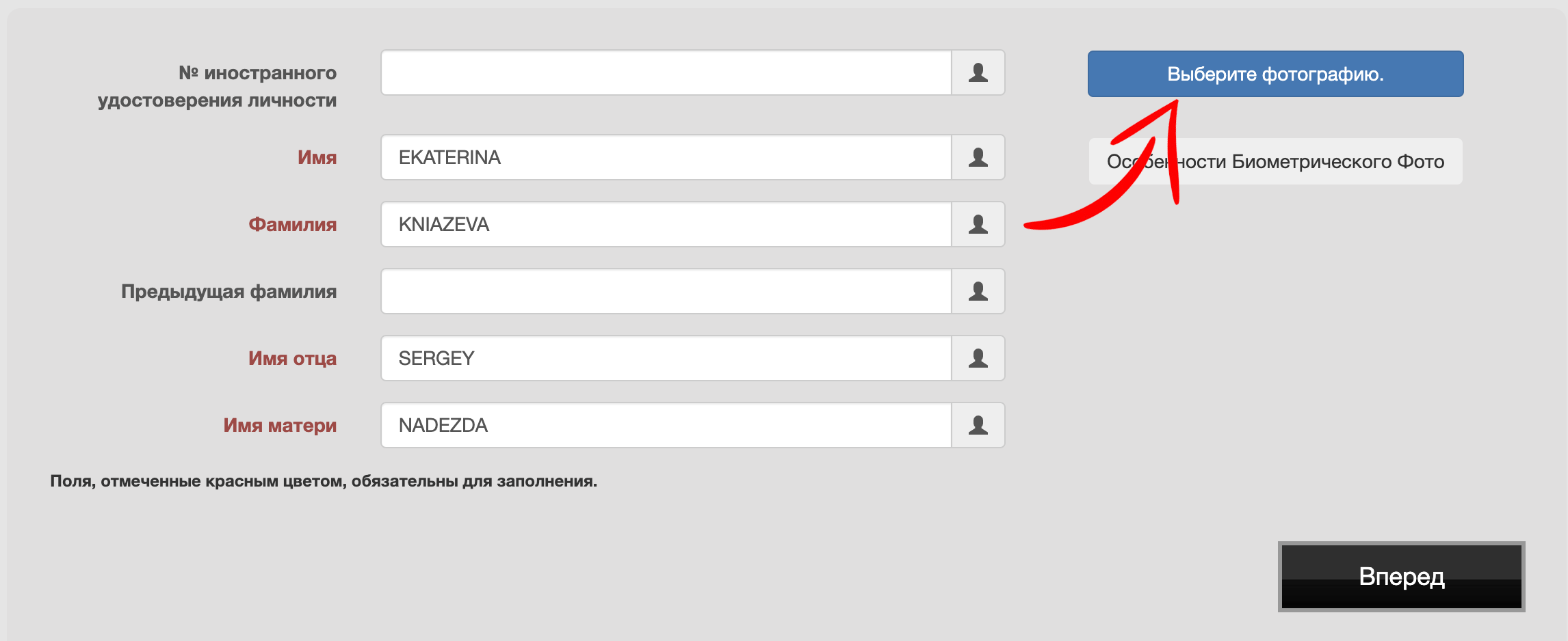 Перед тем как заполнять анкету вам нужно сделать биометрическое фото. Его можно сделать здесь: