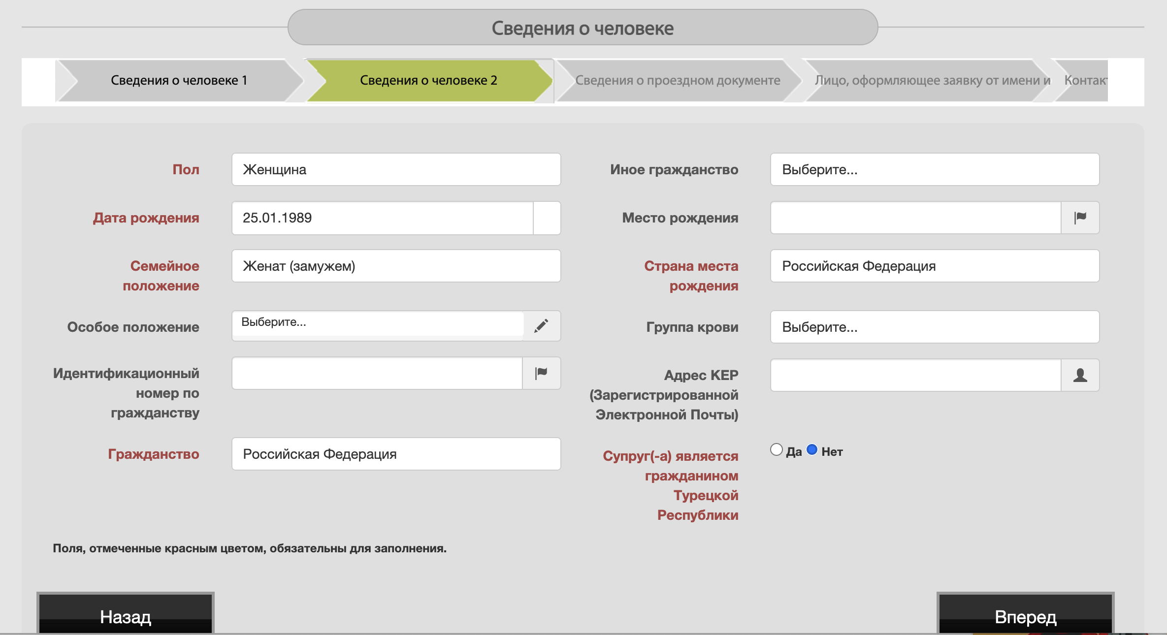 4.6 Далее заполняем сведения о человеке, опять же заполнять нужно только то, что выделено красным.