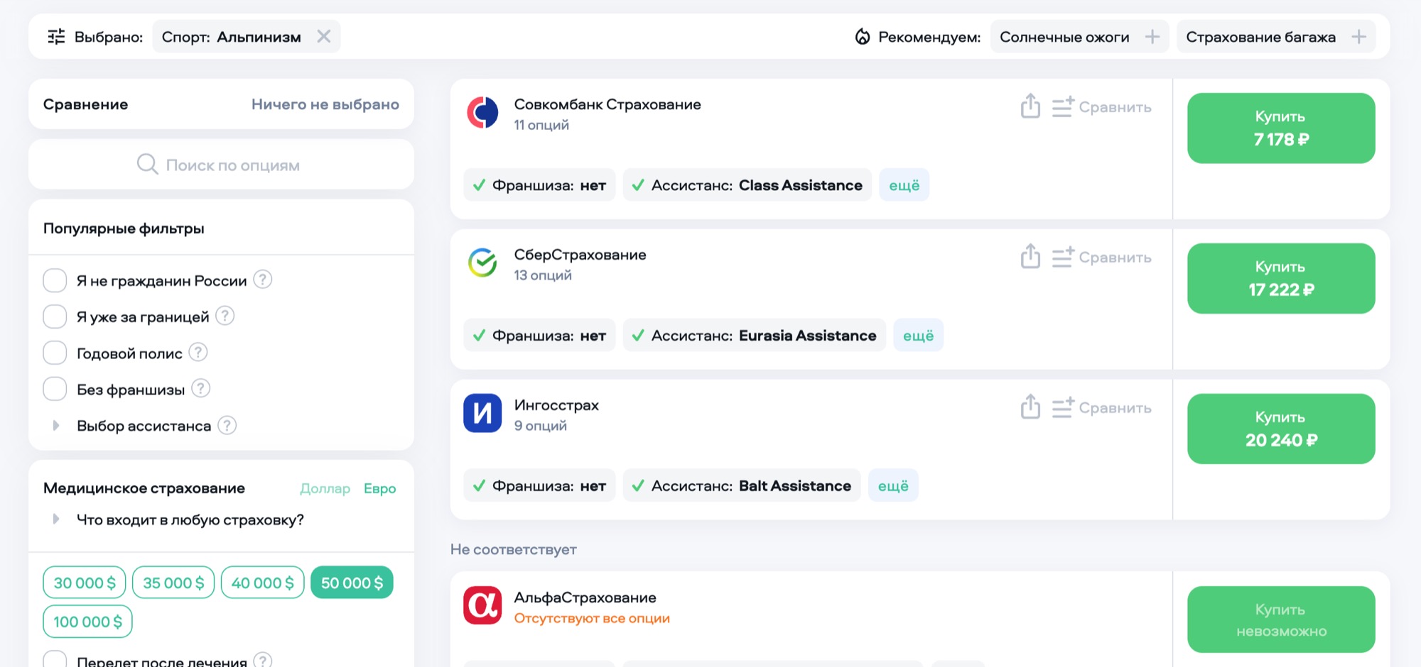 Добавляем в Сравнение все 3 страховые компании и сравниваем. Видно, что у Совкомбанк ограничение в 5000$ на эвакуацию вертолётом, а нам нужно 50000$. У Сберстрахования видим ограничение по высоте - 6000м. У нас же будет 6960м. Среди наших вариантов остаётся только один - Ингосстрах. Нажимаем на стоимость - Купить