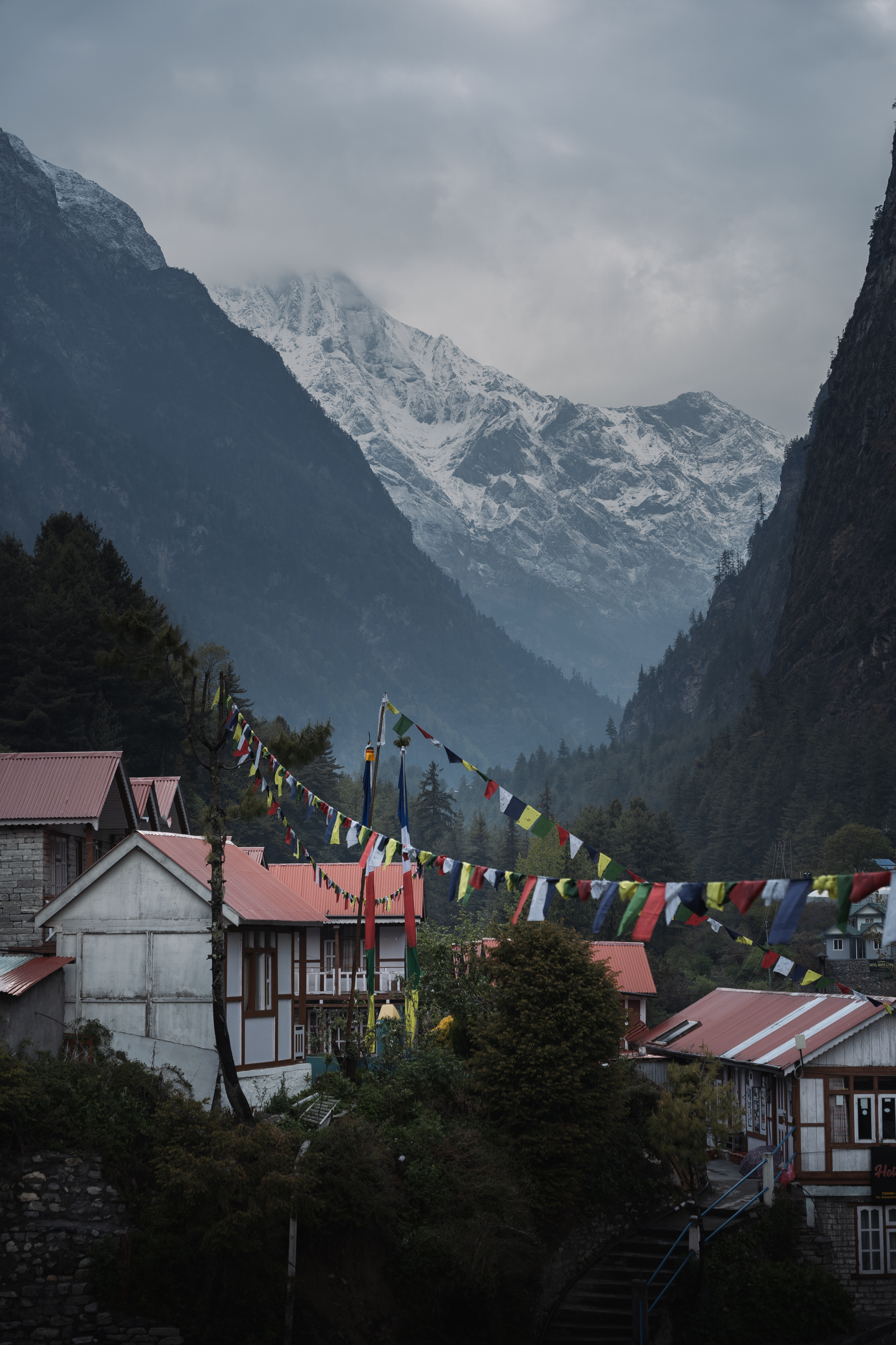 Идём по глубокому ущелью, вокруг отвесные стены, на склонах сквозь камни прорываются на волю маленькие деревья. Повсюду стекает вода. Первый подвесной мост. Не хлипкий на верёвках, как в фильмах про туземцев, а прям новенький и блестящий: металлический. Таких ещё тоже много будет. Флешбеки на Алтай и Восточную Ликийку. Прохладный сырой воздух, деревья, камни, зелень, постоянный шум воды. Через каждые пять-шесть километров какая-то деревня. Видно, что туристов здесь ждут. Почти на каждом доме какая-то вывеска: вкусная еда или лоджия, иногда горячий душ, вай-фай почти везде. Картины не портит – уходя за пределы деревни, оказываешься в Гималаях. Но сегодня мало что видно – небо затянуто, а дождь не прекращается. К полудню зашли в какой-то дом, заказали Masala tea – чай со специями. Разогревающий, с молоком. Внутри дома сухо и тепло. Очень красивая дочь у хозяев с белыми пёсиками. Переждали ливень. Когда начал стихать, мы вышли. Прошли через очередную деревню, поднялись к ступе, рядом с которой местные поют свои мантры и развешивают флажки. Флажки повсюду: на храмах, на деревьях, на заборах, на окнах домов и на электрических столбах. На флажках написаны мантры, и ветер, круглогодично живущий в этой долине, поёт их и уносит в небо.