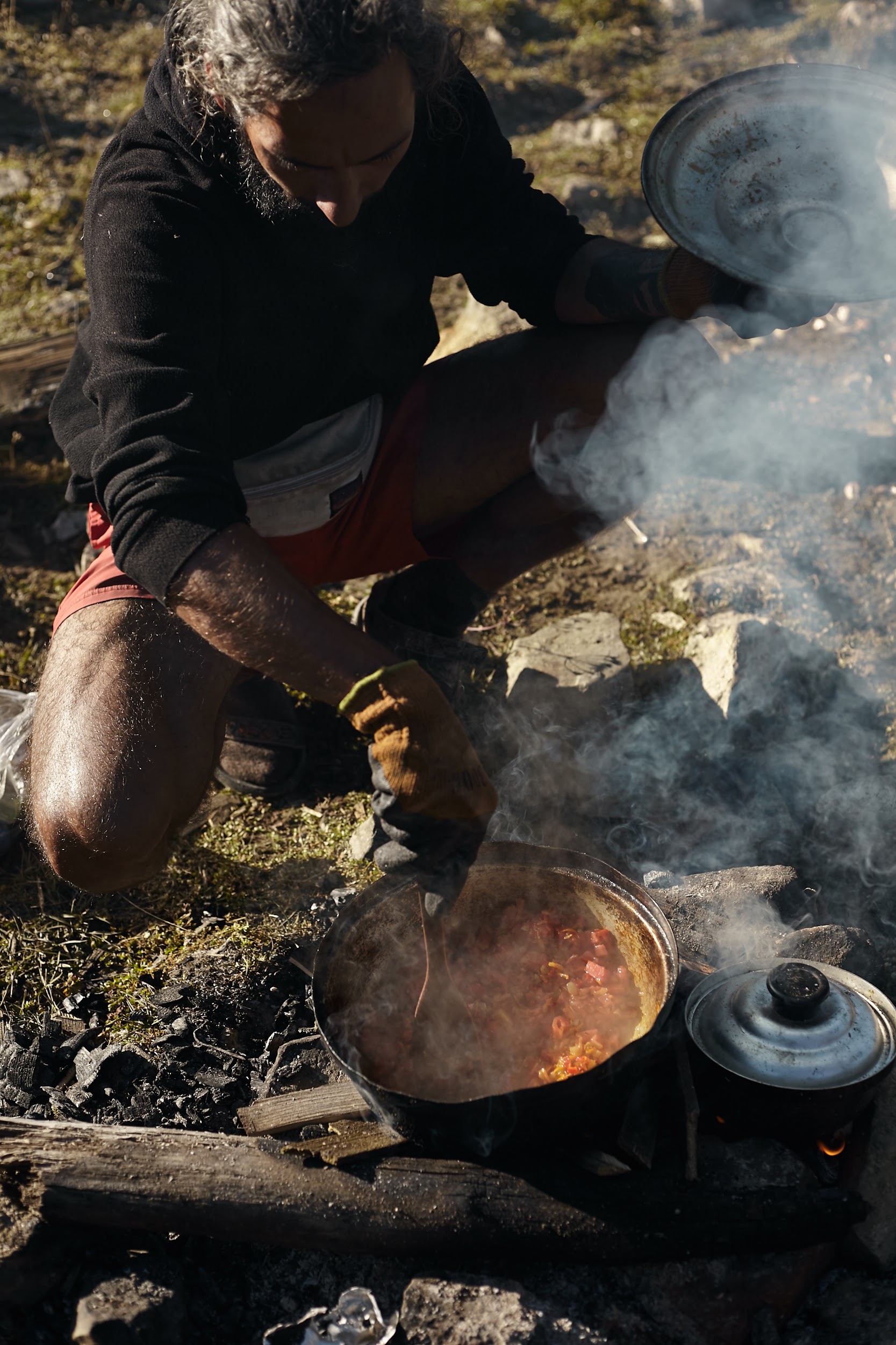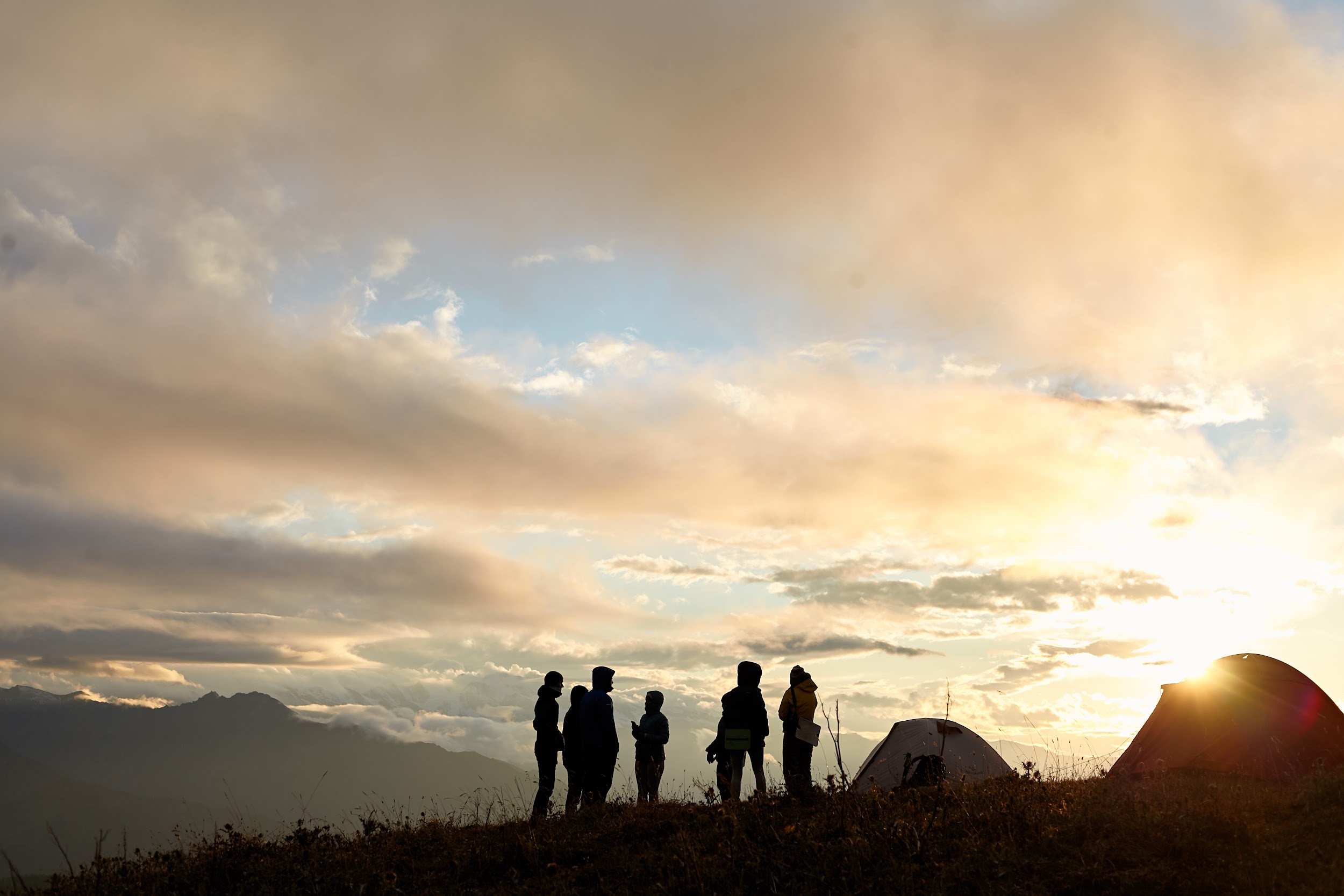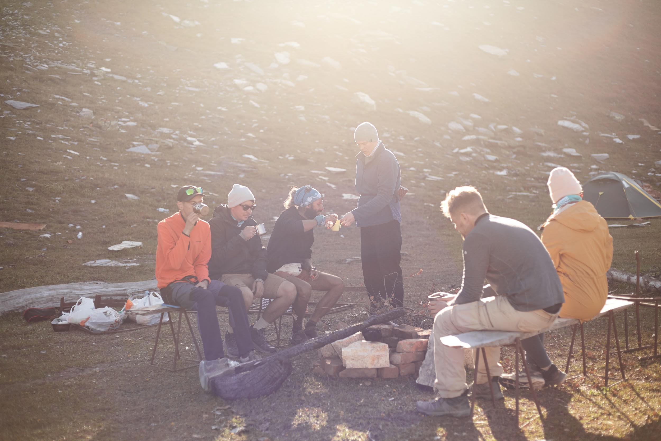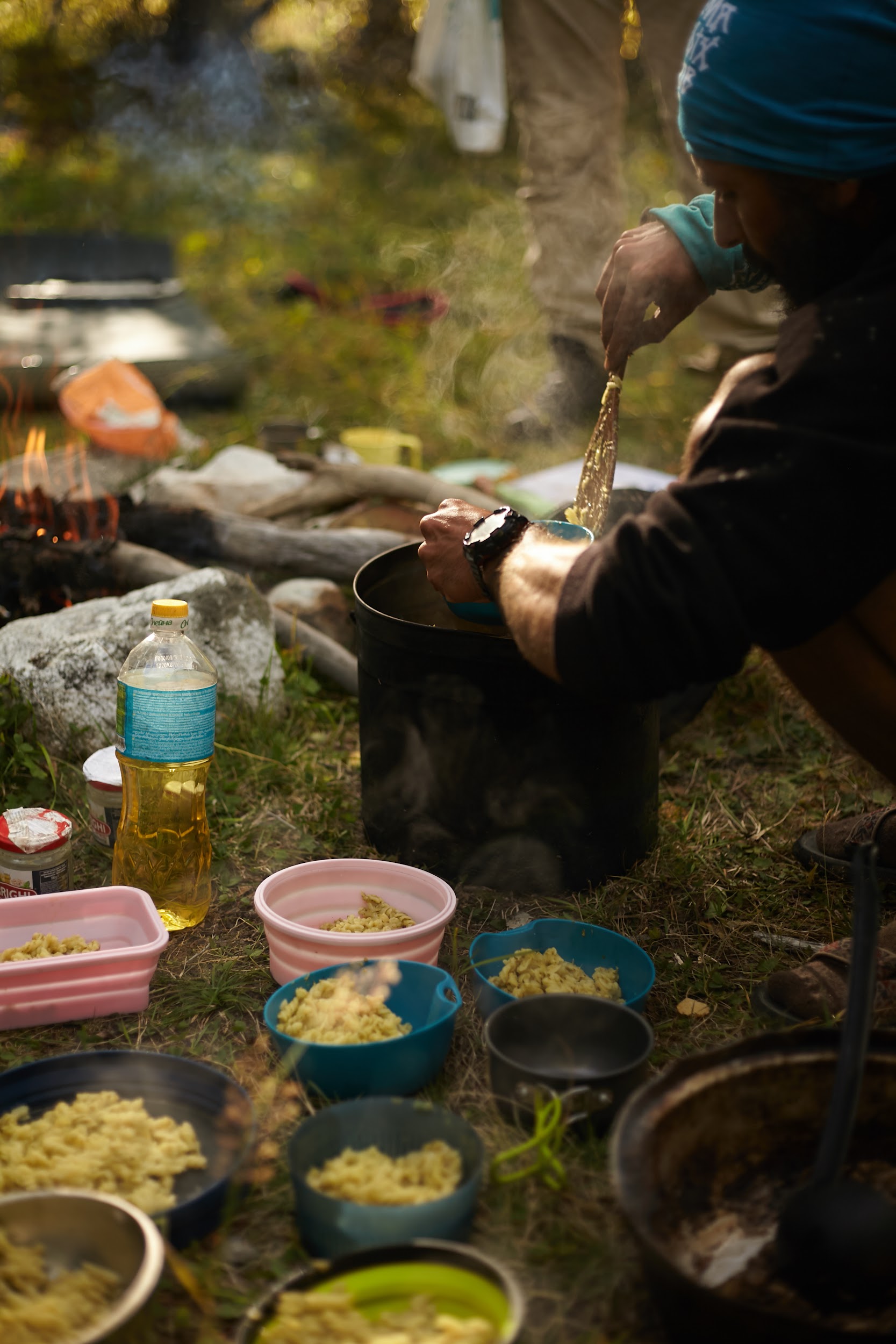 Первая ночь в палатках, вечером уже сильно ветренно, ребята подмерзают, мы готовим первый ужин на костре.