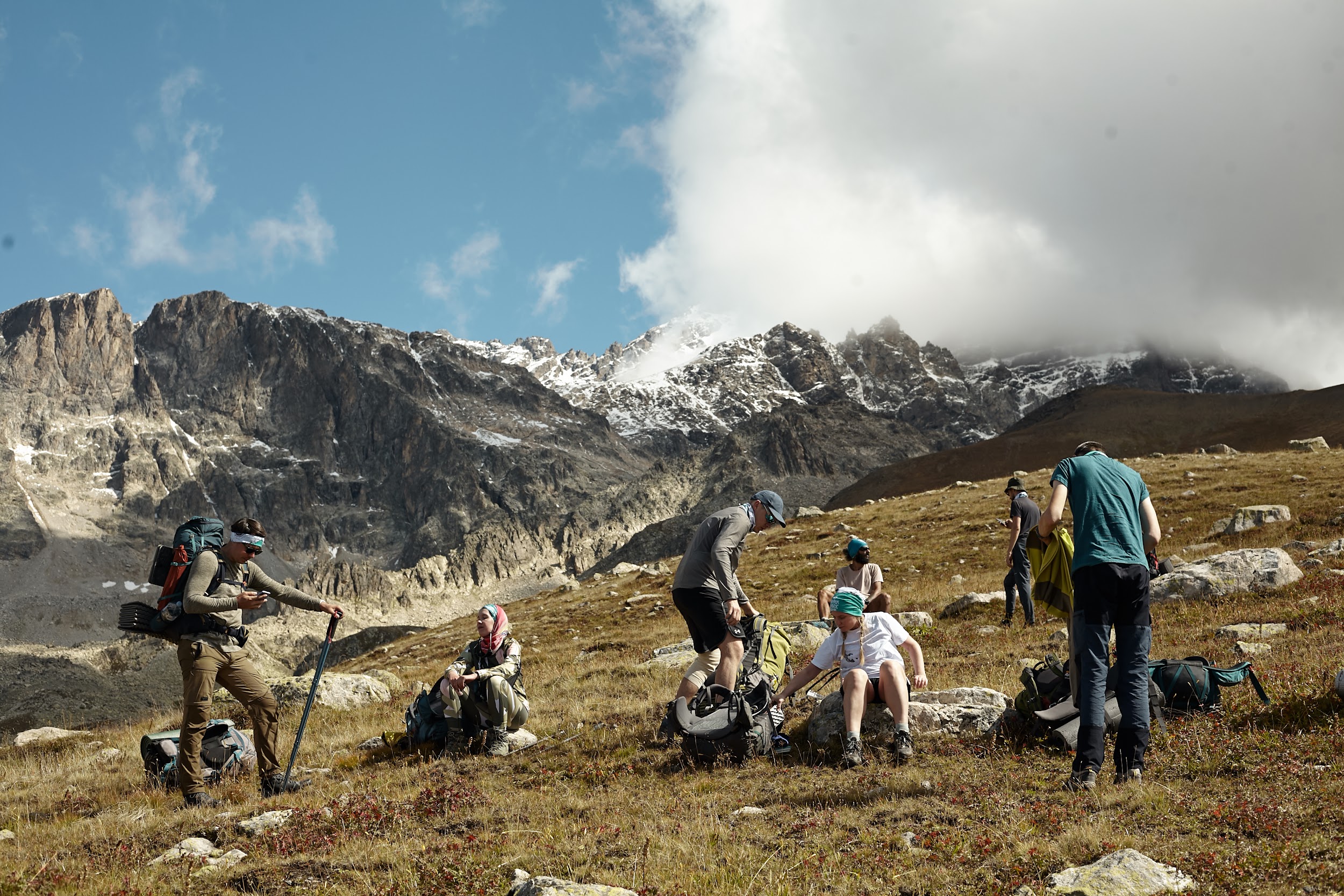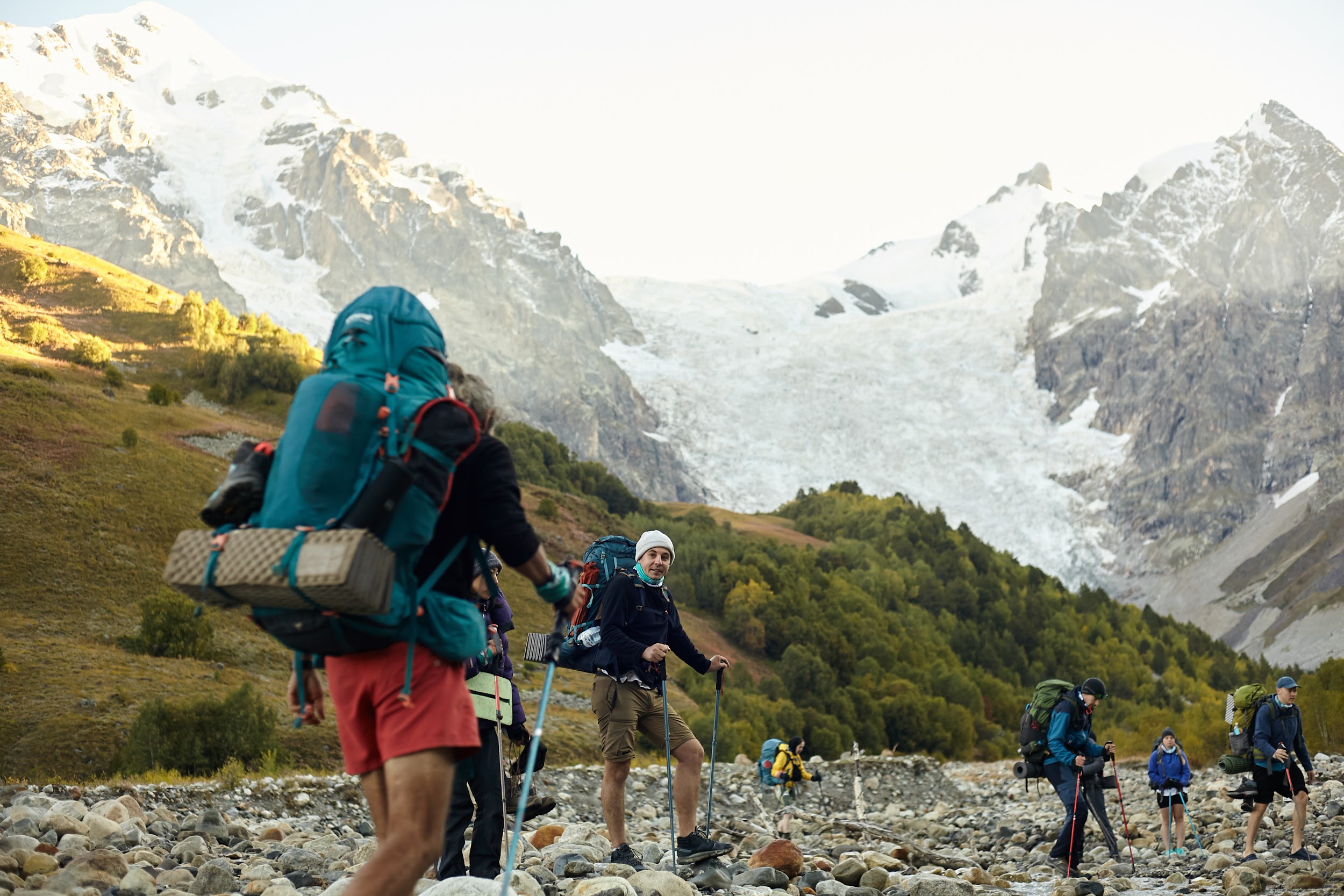 Идем траверсом на перевал, без рюкзаков поднялись ещё на метров 70, чтобы полюбоваться ледником.
