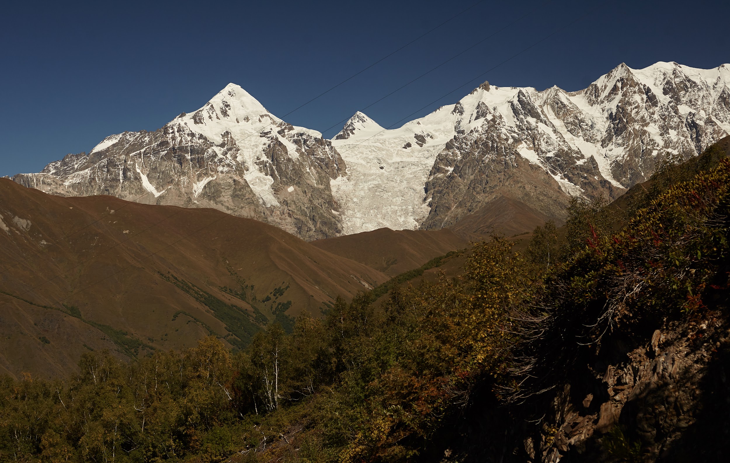 Мы видим гору Шхара, самая высокая вершина Грузии и один из самых сложных пятитысячников Кавказа.