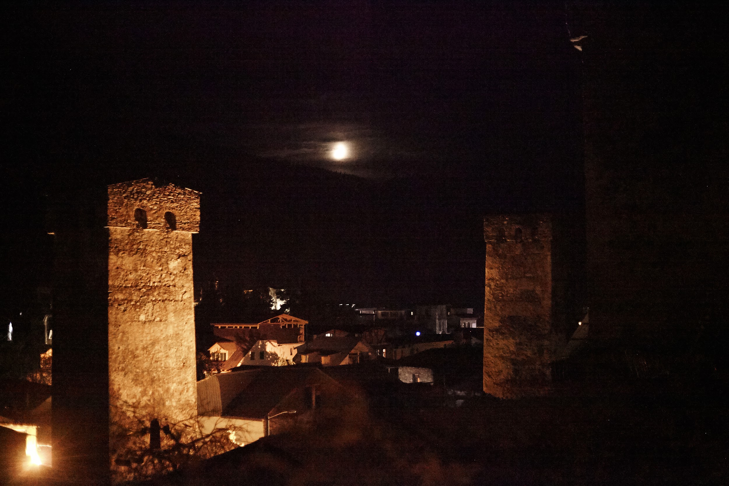 Эрадж быстро договаривается с отелем нас оставить на ночь, тк водитель сообщает что дорога перекрыта и откроется только рано утром. Наши планы меняются, но мы не расстраиваемся, а идём на башни Нарекало пить вино и смотреть на ночной Тбилиси.