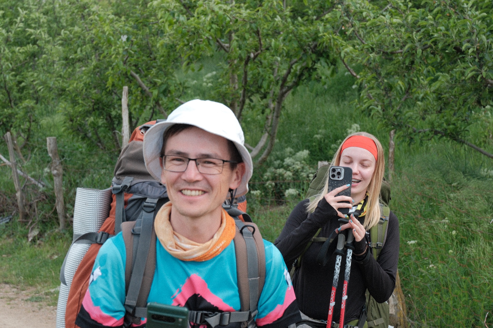 Шли по дороге, а потом садами. Вспомнил работу на сборе яблок в совхозе в старшей школе, вообще головой на Кубань вернулся. Люди нам сигналили, махали руками и непременно улыбались.