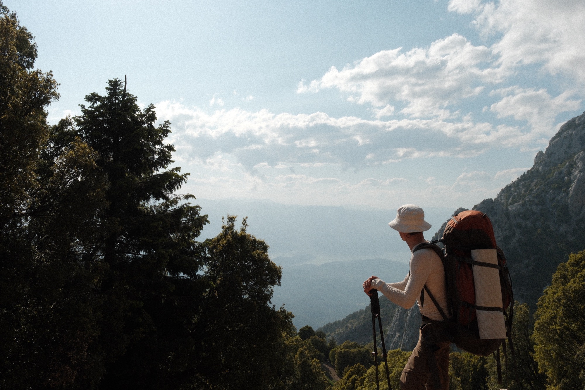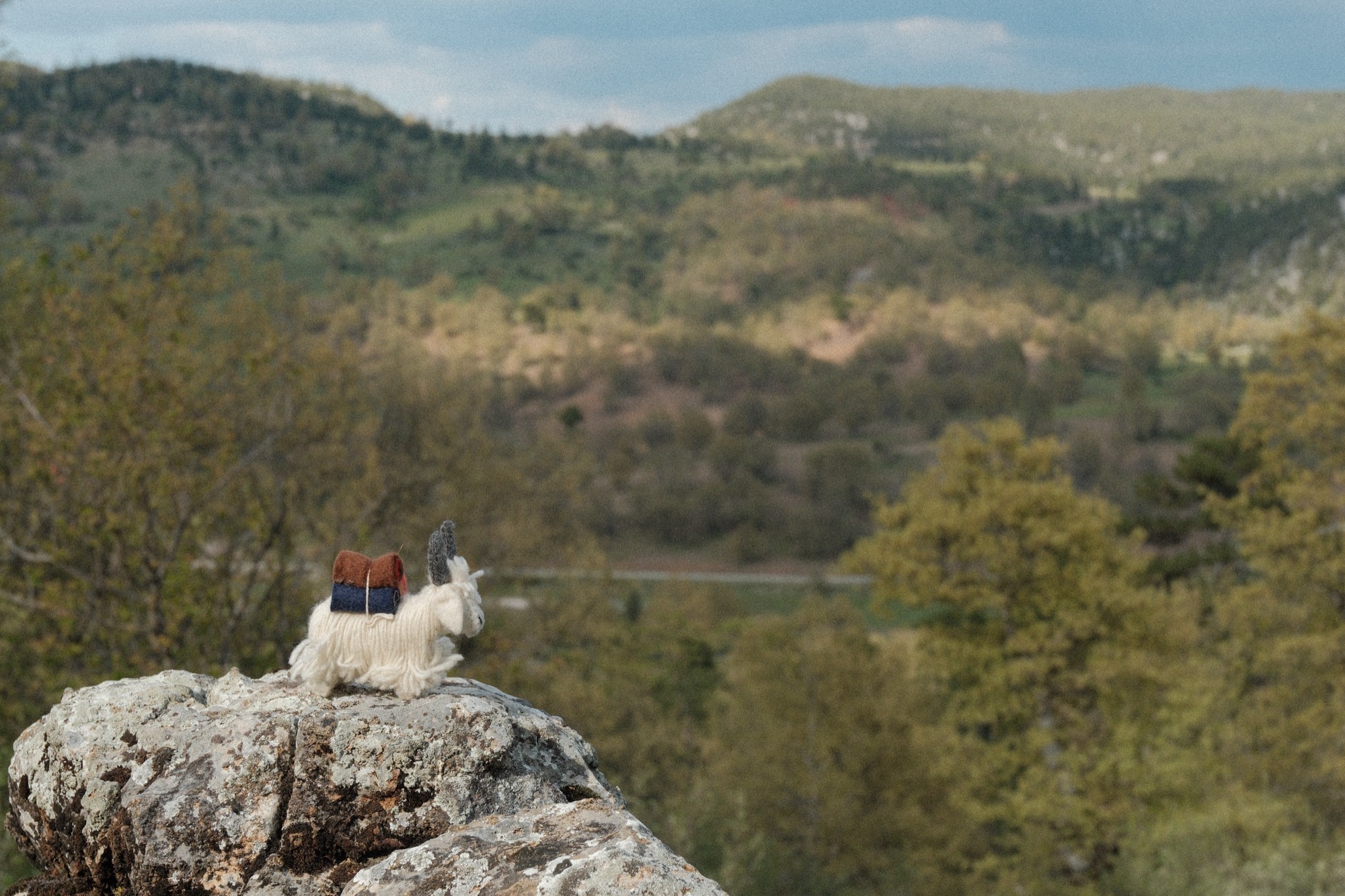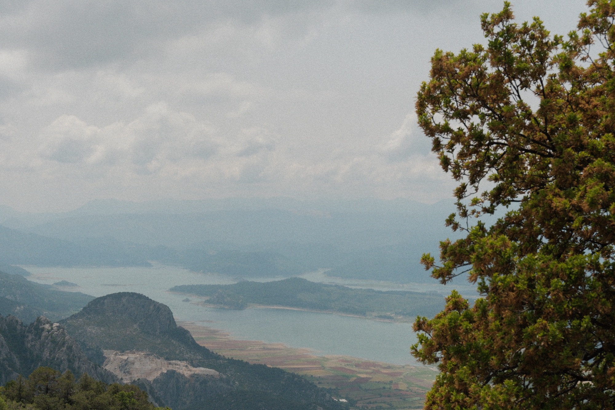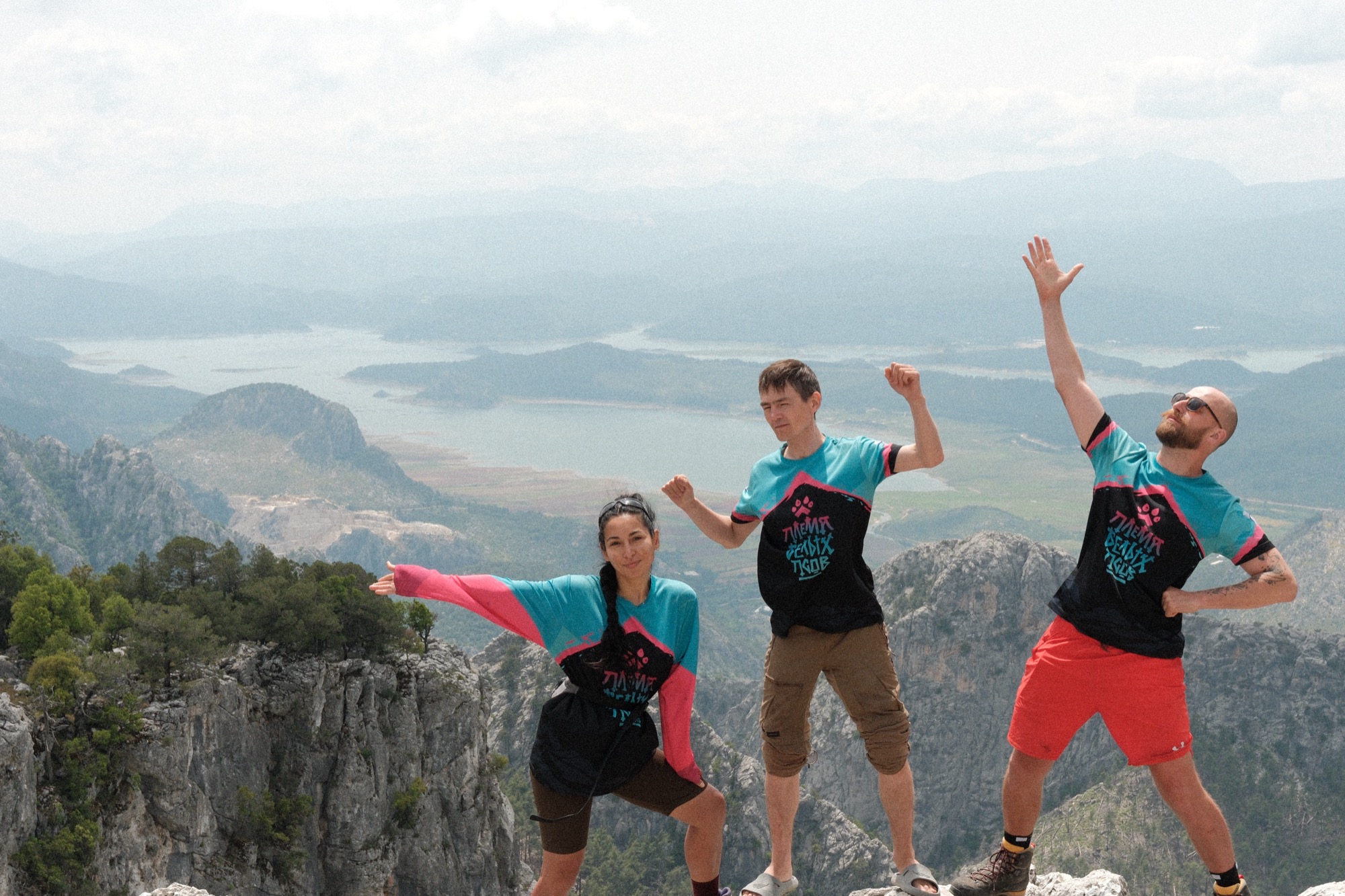 Описательно предстоял самый сложный день. Сначала довольно крутой подъем, плато, а потом тысяча метров спуска. Влетел наверх своим темпом и полчаса сидел в одиночестве, рассматривая рельеф, слушая ветер и периодически залипая в телефон. На смотровой площадке устроили выдающуюся фото и видео сессию. Танец крабика у клабика. Воинственный тапок. Руки вскинуты вверх. Головы вертятся то влево, то вправо. Щелк. И еще разочек. А теперь вот так. Красиво. Как-то сказочно красиво! Озеро из забытых снов, горы, карьер мрамора, величественные сосны, островки цивилизации из деревушек и безграничная перспектива… Ветер развивал волосы. Смех и дичь сменялись созерцанием. По телу и голове блуждало удовольствие.