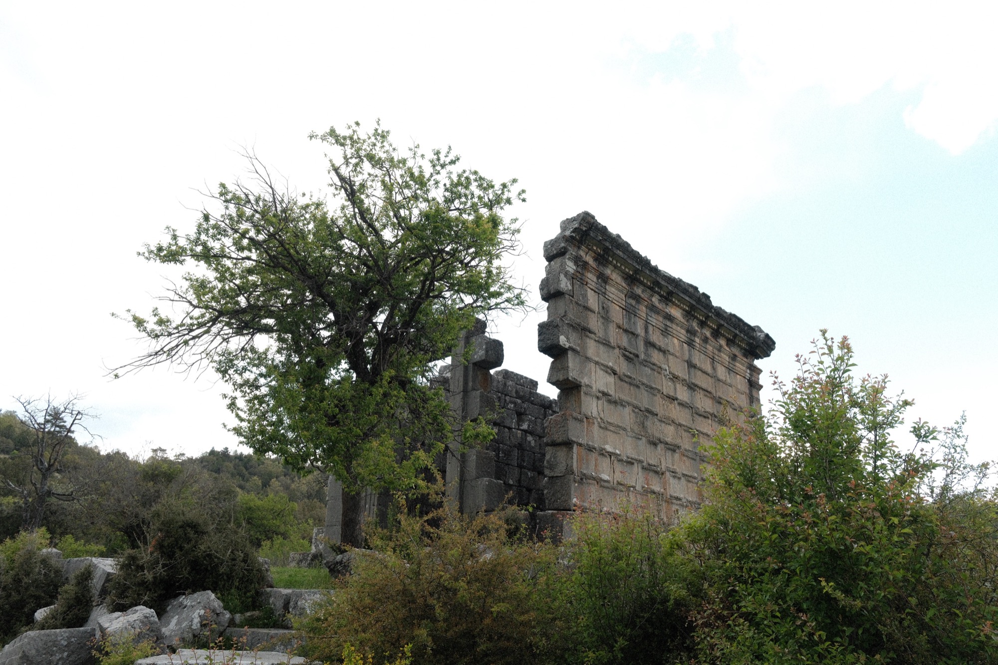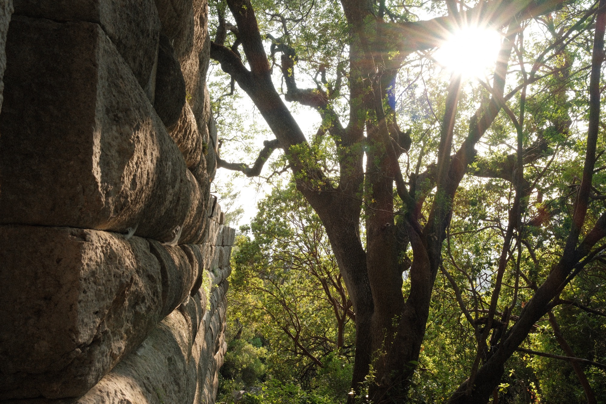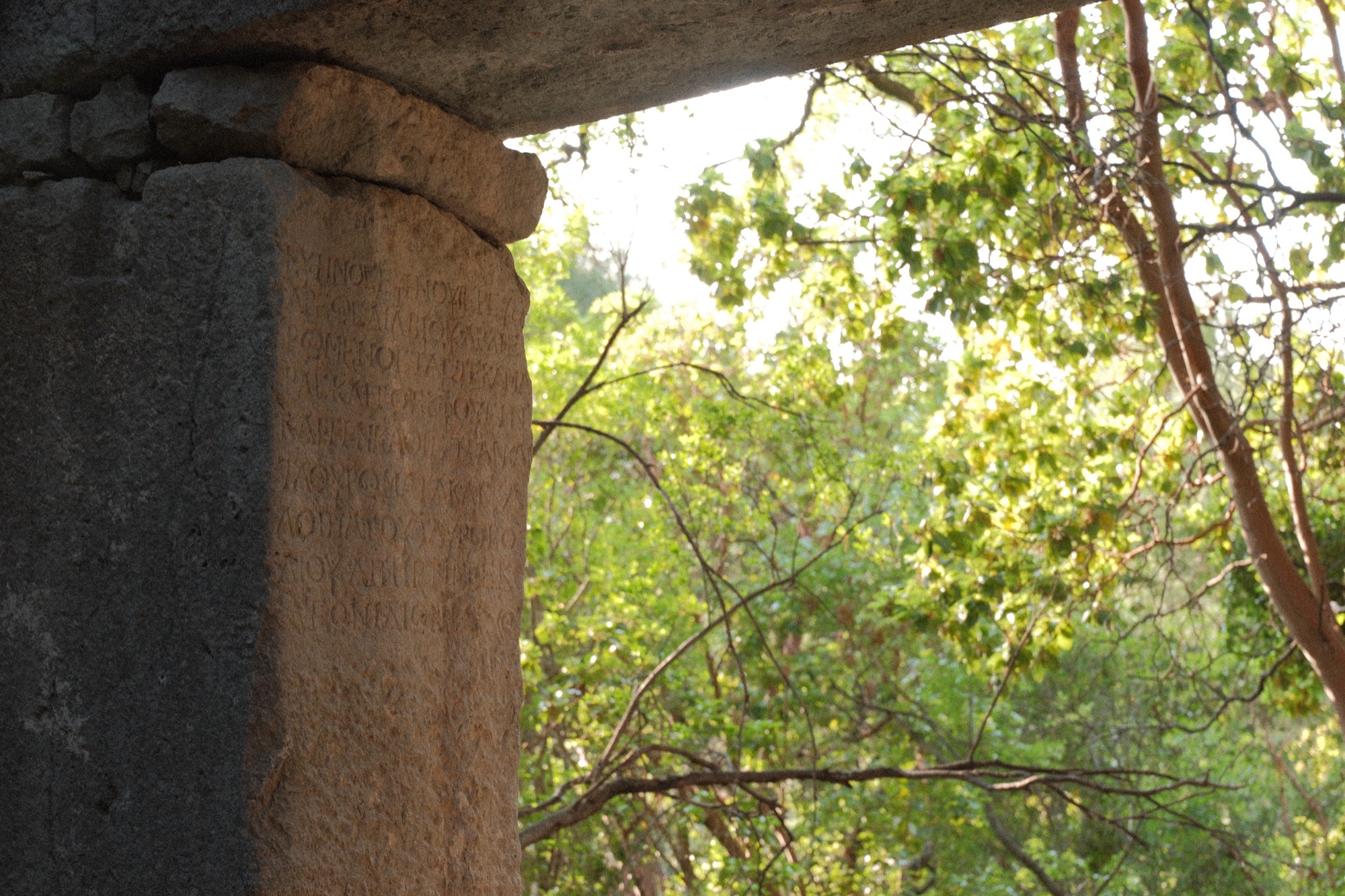 Дорога перешла в заросший магический лес, где снова учесал вперед и обрел абсолютную тишину. Усталость, медитативный подъем, красивая природа, спонтанные солнечные лучи и так полчаса, час или больше. Сколько? Я бесповоротно пропал во времени. Из сомнамбулического состояния вывели руины древнегреческого города. Сначала два огромных колодца, с определенных ракурсов раскрывающих бездну, а затем крепость во власти мощных деревьев. Во мне проснулся ребёнок. Во мне проснулся исследователь. Во мне проснулось что-то никчемно описываемое словами. Фотографировал. Щупал. Прислонялся и слушал. Залезал внутрь и обходил снаружи. А еще на карте эти руины даже не обозначены. Удивительно! Впервые почувствовал то, что запросто описать, но вот ощутить… В этом городе я ощутил, будто бы из 3000 года и гуляю по руинам года 2000. Природа взяла свое, греческий алфавит мне так же не понятен, как и скорее всего непонятен им, то есть нам будущего.