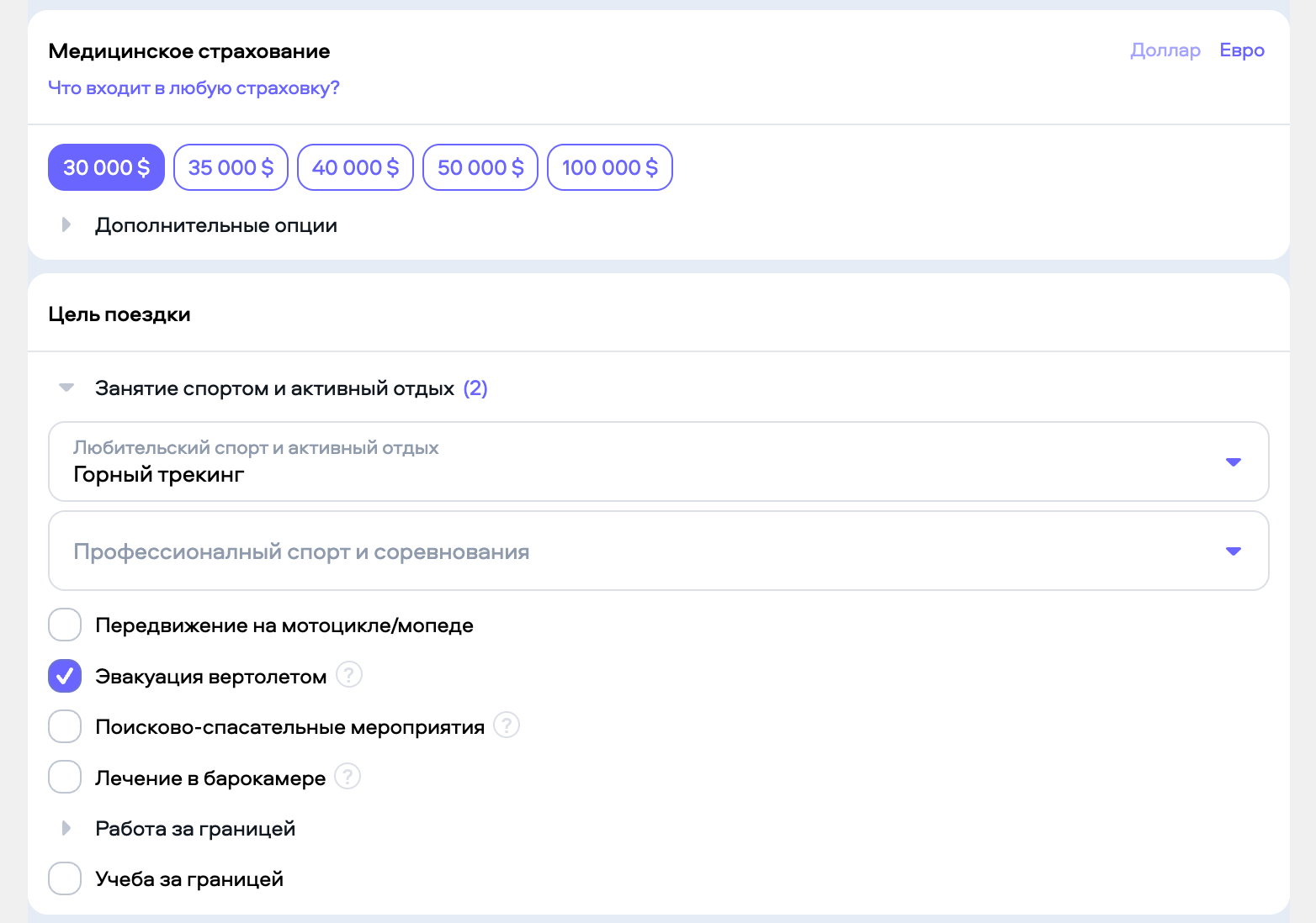 Изменить медицинское страхование на 30000$ и добавить "Эвакуация вертолётом".