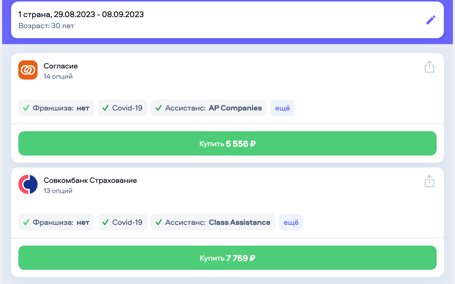 Как видим, есть два предложения от "Согласия" и "Совкомбанк Страхования". Нажмите на "Ещё", чтобы увидеть подробно, что предлагают эти компании. Сравним эти два варианта: