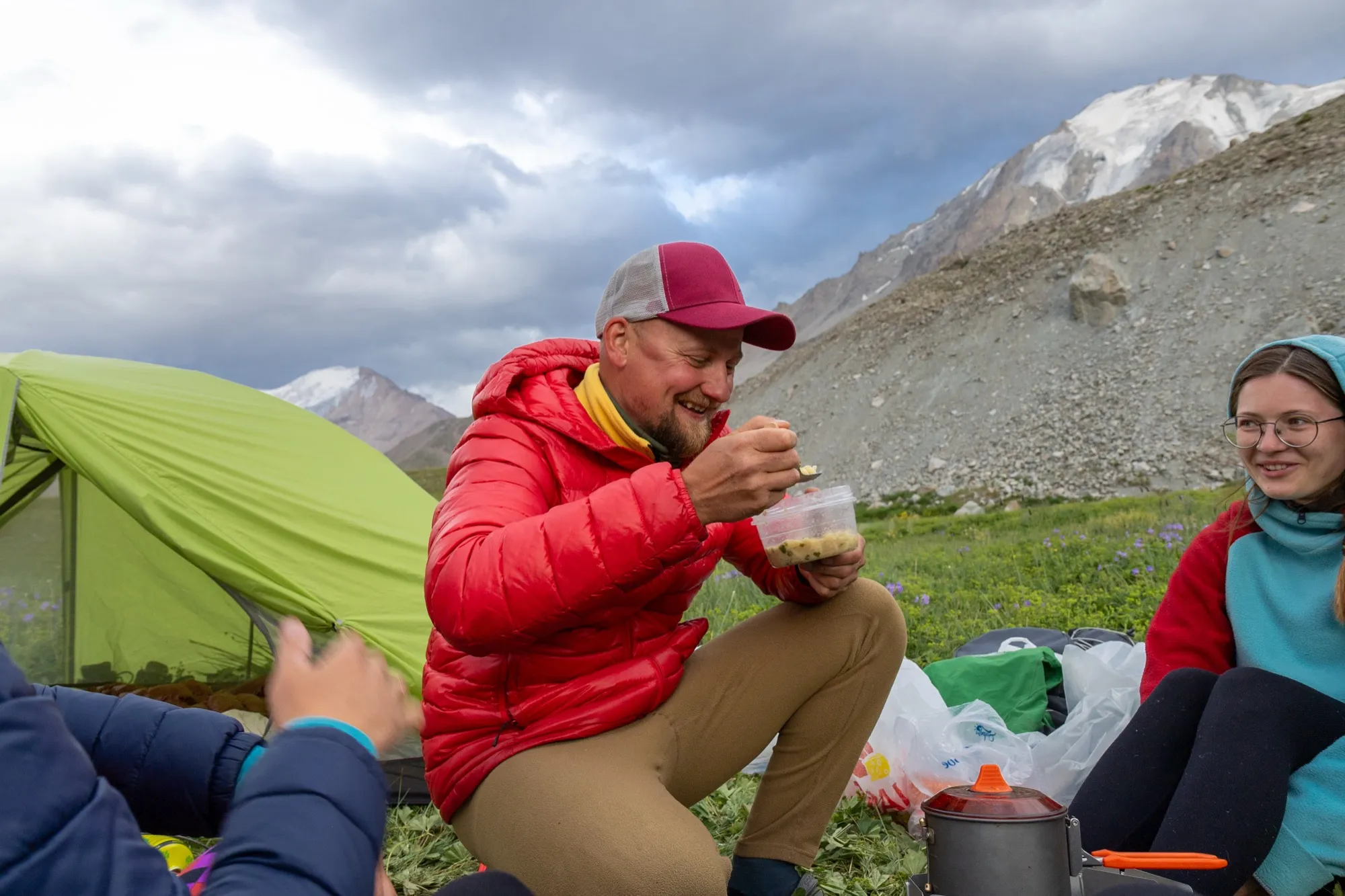 Сегоня у нас не сложный день. Идём налегке на перевал Алматы-Алагир, с которого открывается вид на Проходное ущелье. Оттуда поднимаемся на пик Карнизный. Вид отсюда ещё более захватывающий! Наслаждаемся, и идём в лагерь готовить ужин.