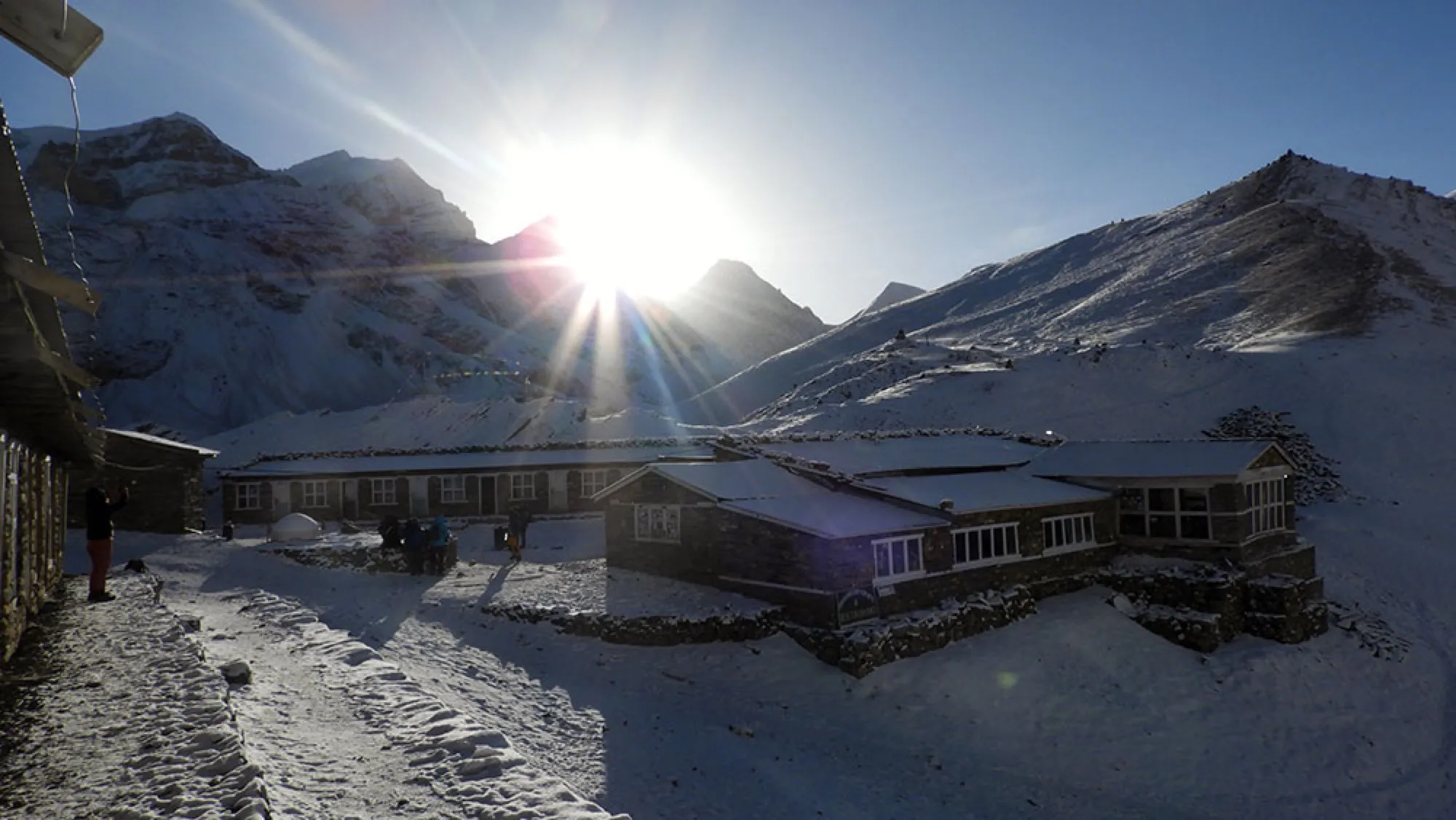 Морозное утро, уже привычный завтрак из омлета, тостов, варенья и кофе. Выходим пораньше, дорога сегодня долгая. Пойдём по верхней тропе, чтобы видеть всё великолепие Гималаев сверху. Выйдем на плато, дальше небольшой спуск и самый длинный мост в Непале - 400 с лишнем метров. Выйдем мы в кемпинг, в котором туристы также останавливаются перед перевалом, но это наша не конечная цель. Здесь мы можем пообедать или выпить кофе с яблочным пирогом и дальше тронуться в путь. Нам остаётся набрать ещё 350 метров крутого серпантина. Наконец, мы выходим в Хай Кемп на высоту 4925м. Если будет светить солнце, то будет тепло, если нет - то довольно прохладно. В любом случае заселяемся, кутаемся в пуховки и штаны и идём заказывать Масалу и играть в игры. Здесь ценник уже раза в два, а то и в три выше чем в низинах, но отказаться от горячей тукпы или пиццы невозможно.