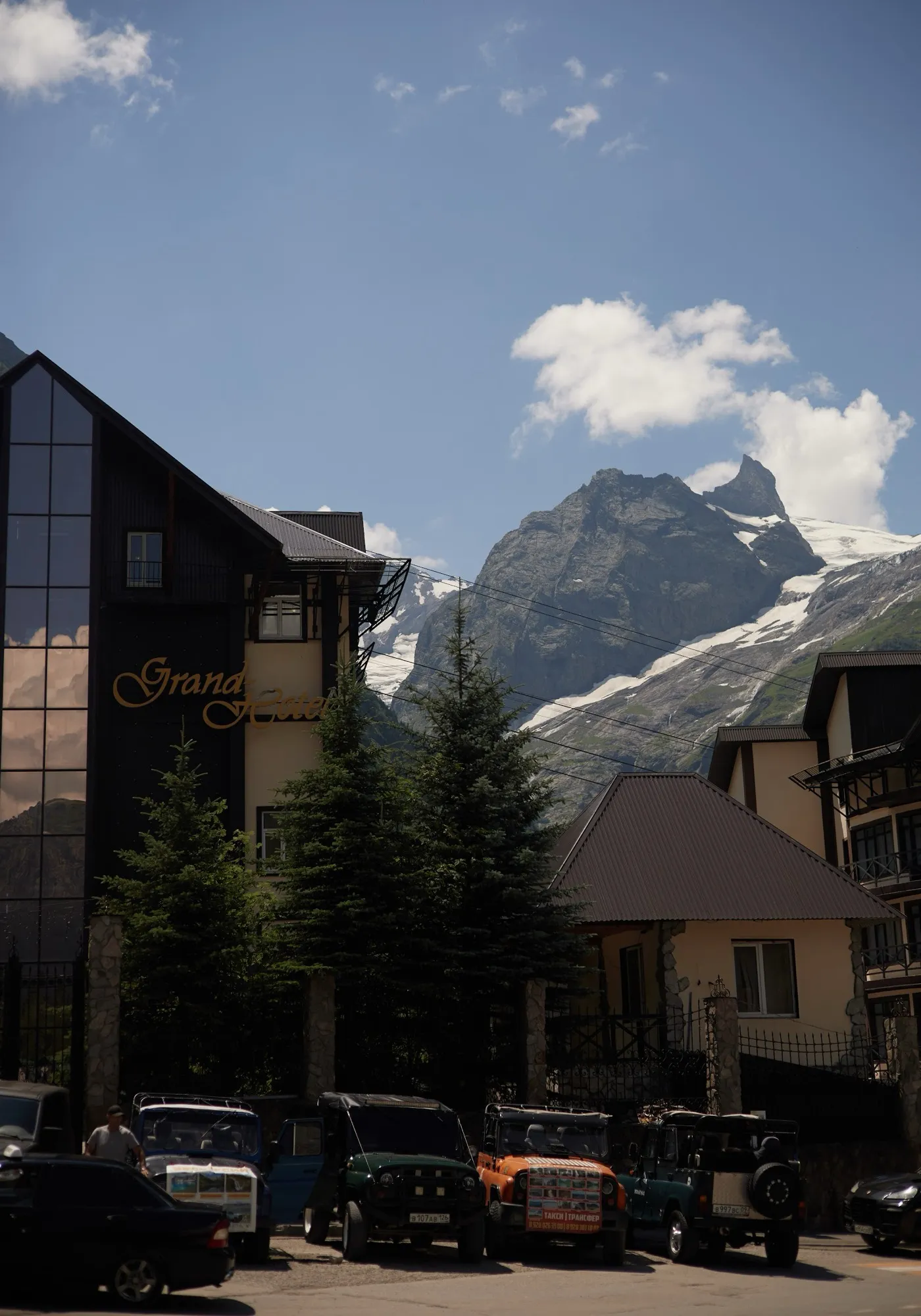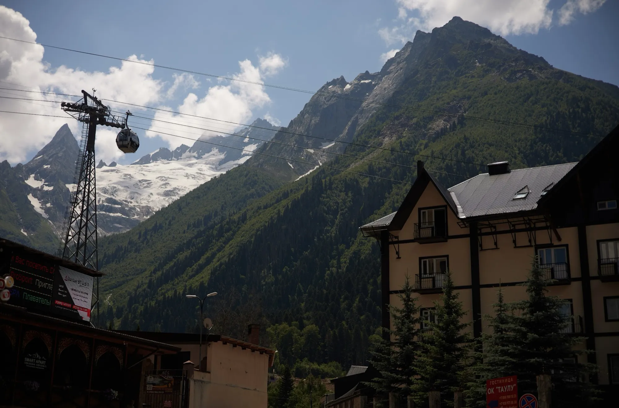 Сегодня отдыхаем. Можно по желанию подняться на канатной дороге до 3000 м, прогуляться к водопадам или просто смотреть на горы. Ночь в Домбае.