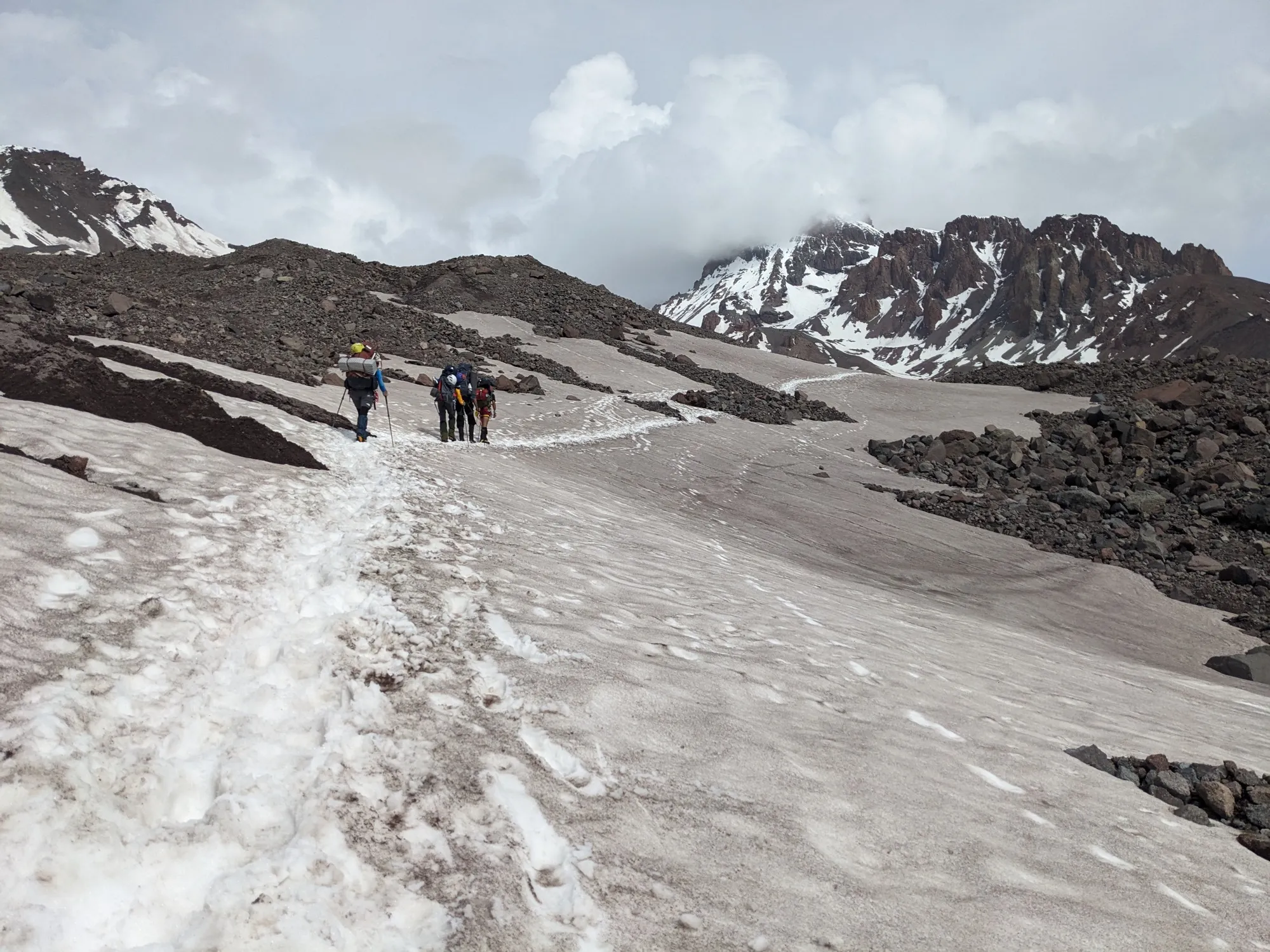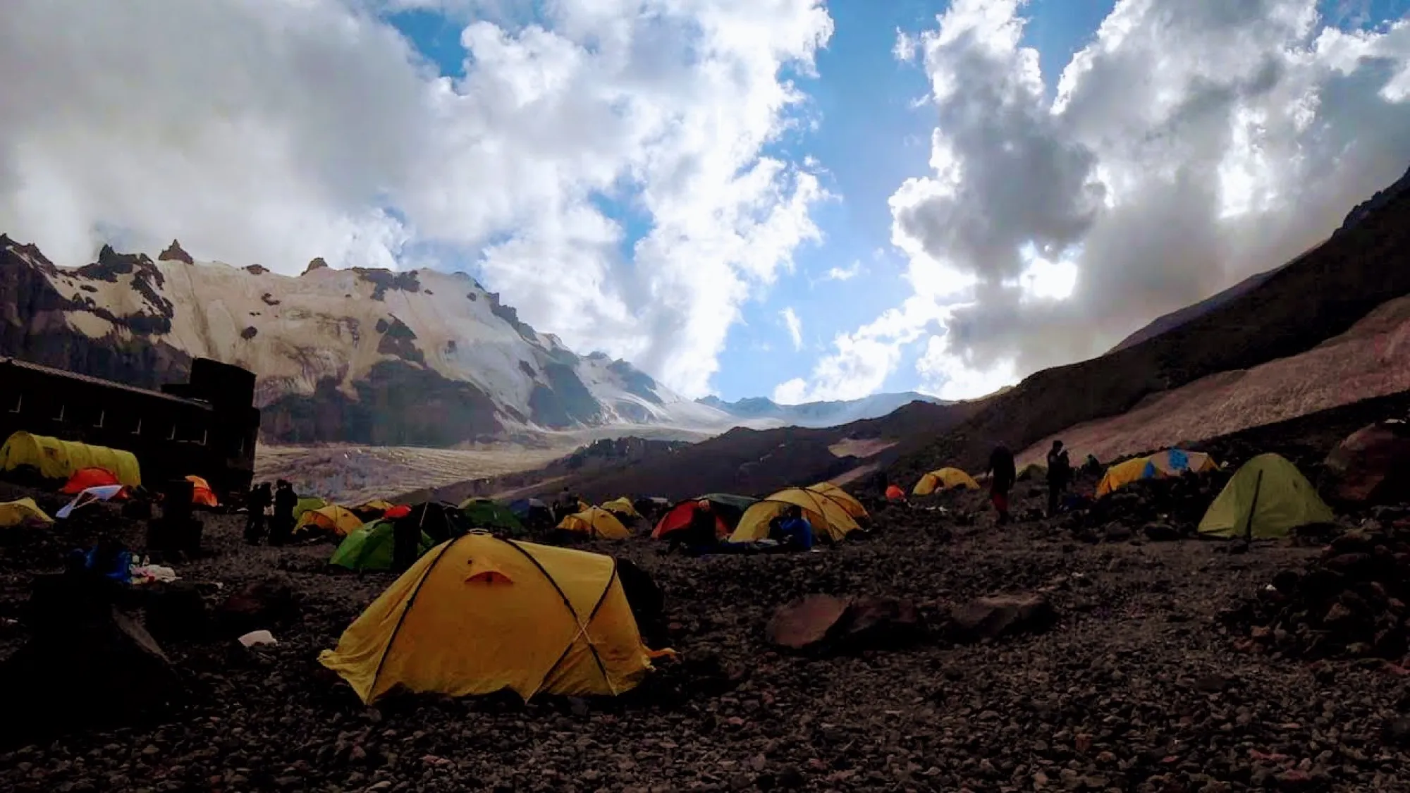 Завтракаем, собираемся и выходим в сторону ледника Гергети. Уже здесь нам понадобятся кошки. Ровным темпом дойдём до нашего первого высотного лагеря "Приют Бетлеми", более известная под названием "Метеостанция", расположенная на высоте 3650 метров.