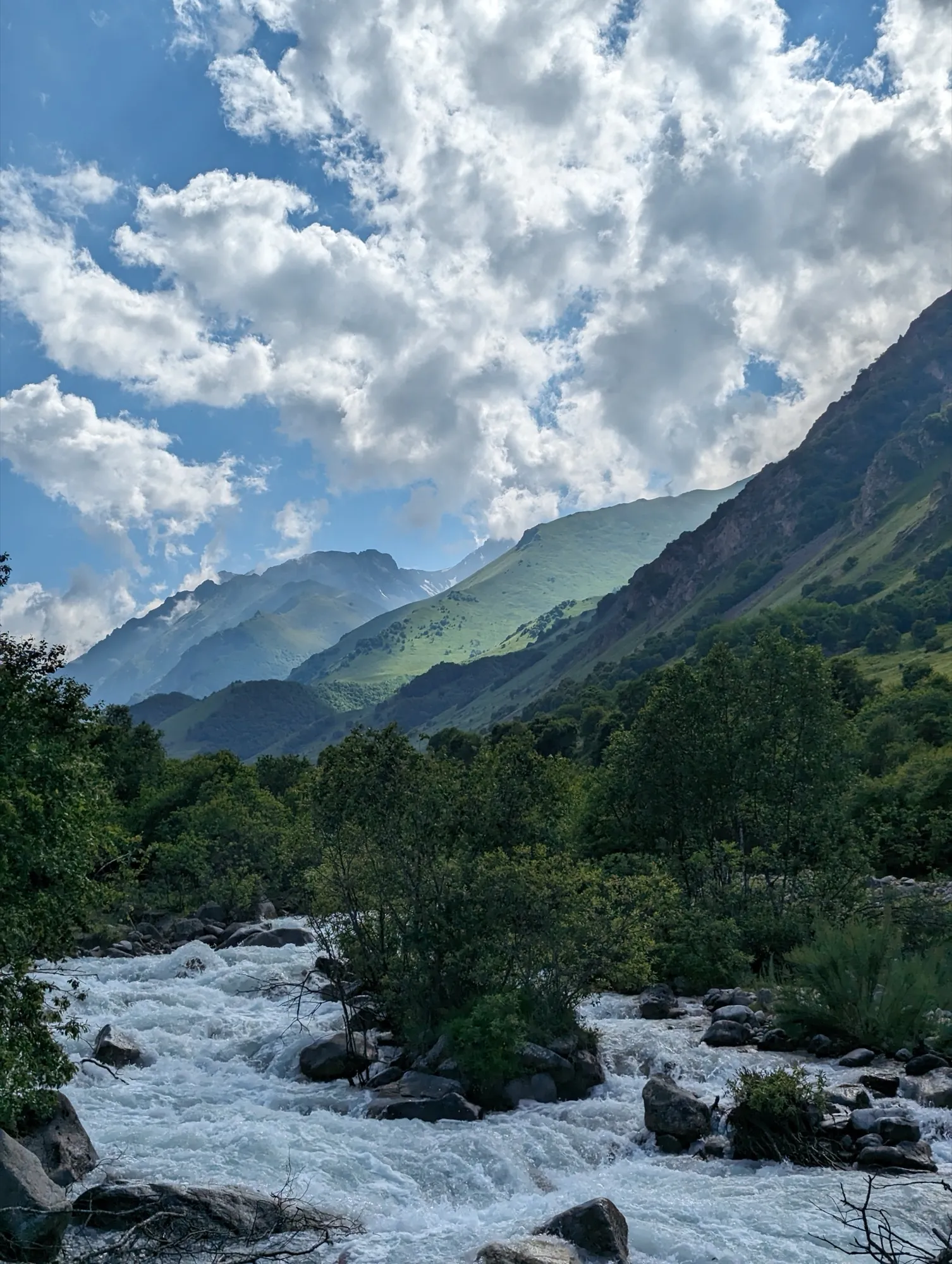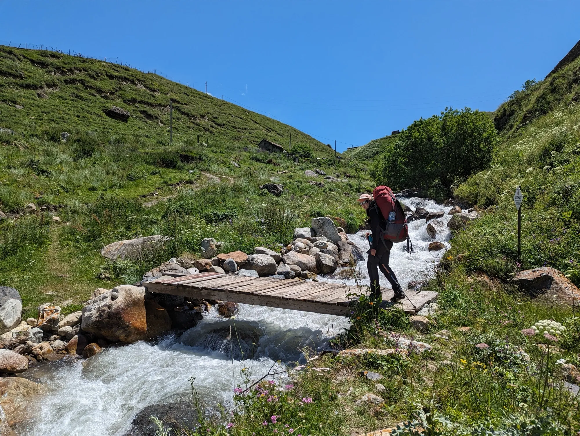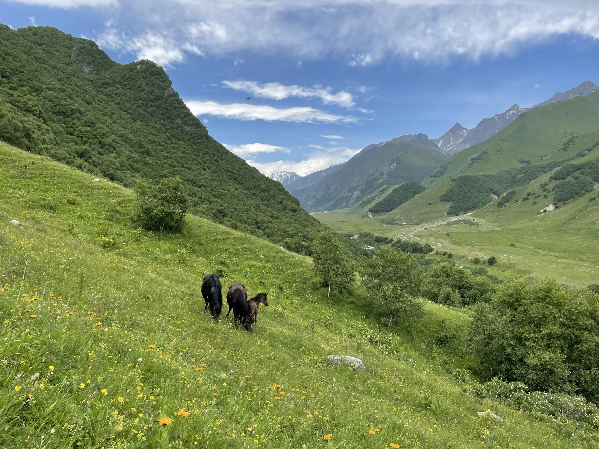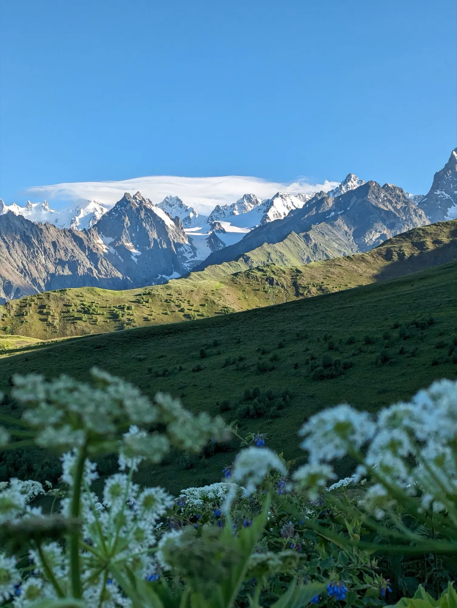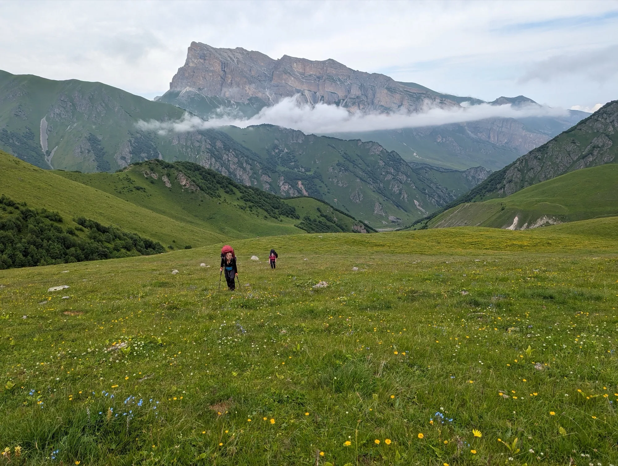 Первая часть начинается в селе Ташлы-Тала (КБР). Мы преодолеем два перевала, где нас ждут насыщенные зелёные пейзажи и яркие цветочные поляны. Завершив этот участок, спустимся в село Дзинага, где устроим дневку. Здесь же, при желании и силах, сможем отправиться к Караугомскому леднику.