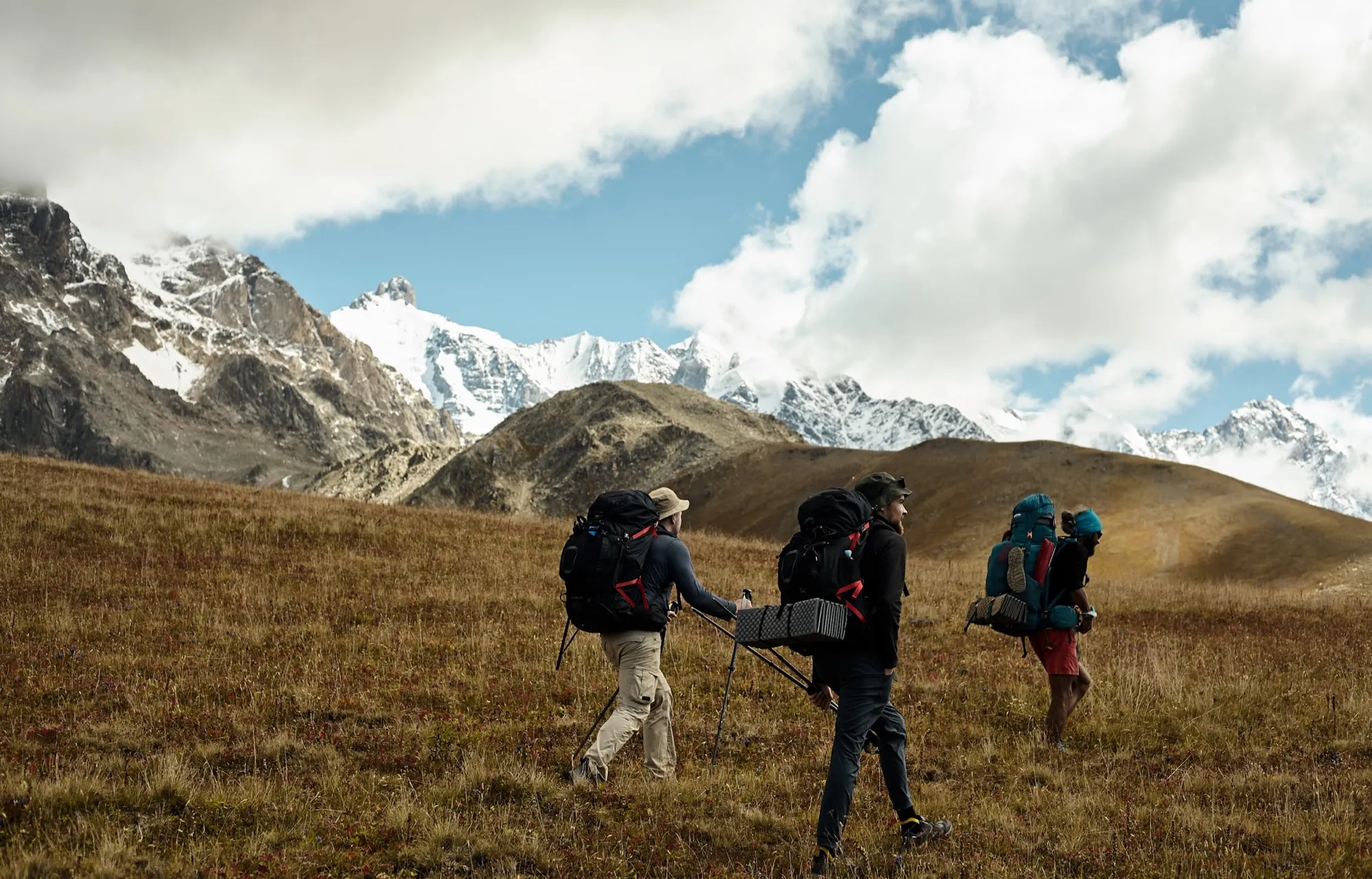 Неспешное утро. Готовим яичницу на костре, пьём кофе с круасанами, собираем палатки и рюкзаки и выдвигаемся. Сегодня потрясающая тропа. На протяжении всего дня мы будем видеть Кавказский хребет прямо рядом с нами. Сзади будет Ушба, слева огромный Тетнульд, а вдалеке будет виднется Шхара.